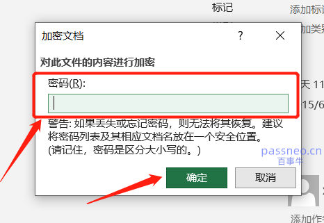 在【打开权限密码】中输入密码,确定 → 再次确认密码,然后保存文件即可。