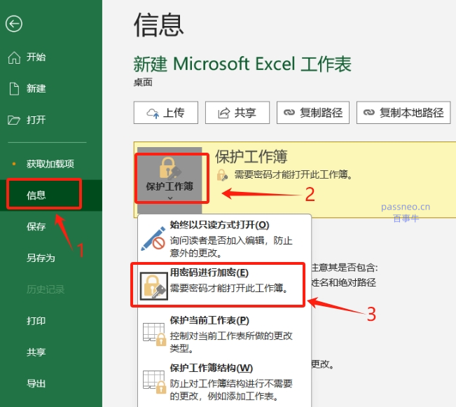 1、打开 Excel 文件,点击【文件】选项,再依次点击【信息】→【保护工作簿】→【用密码进行加密】。