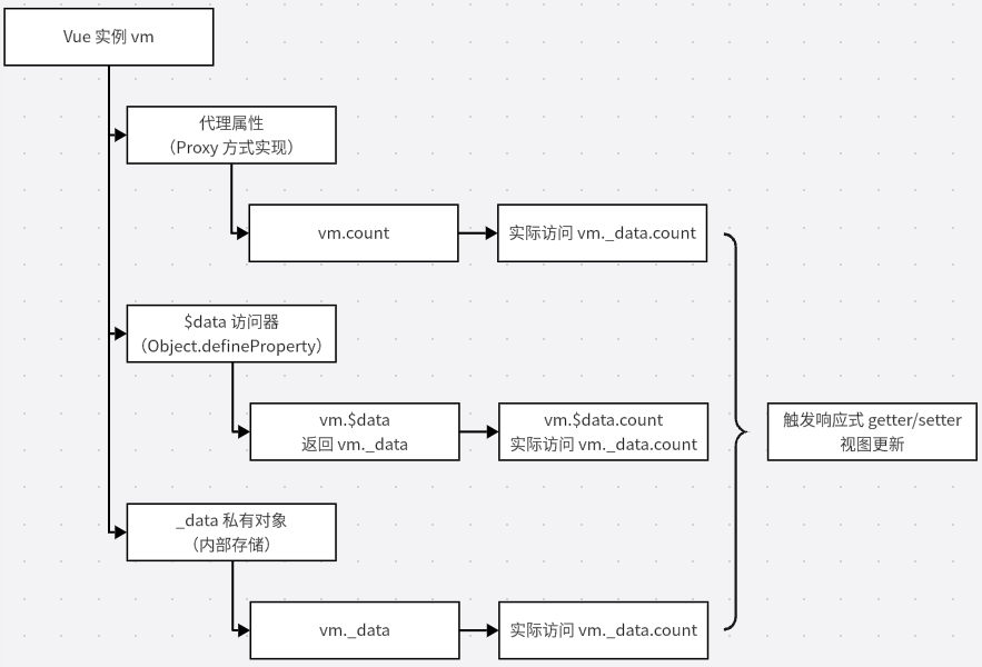 TypeScriptObject.defineProperty(Vue.prototype, '$data', { get() { return this._data } })因此我们修改 vm.$data.count 等价于修改 vm._data.count,并同时触发响应式更新
