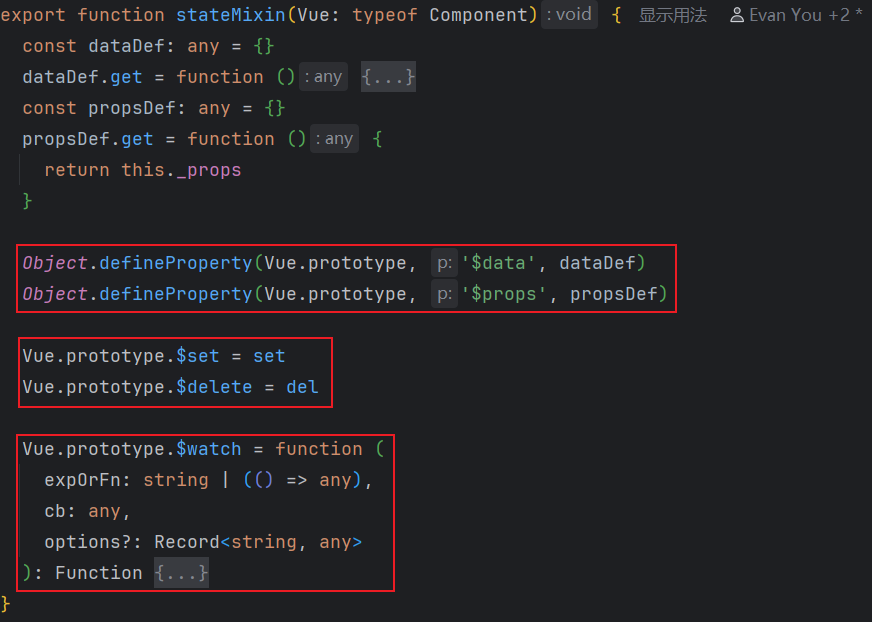 在 stateMixin 函数中,依次将 data、props、set、delete、$watch 挂载在 Vue 原型上,接下来我们依次剖析。