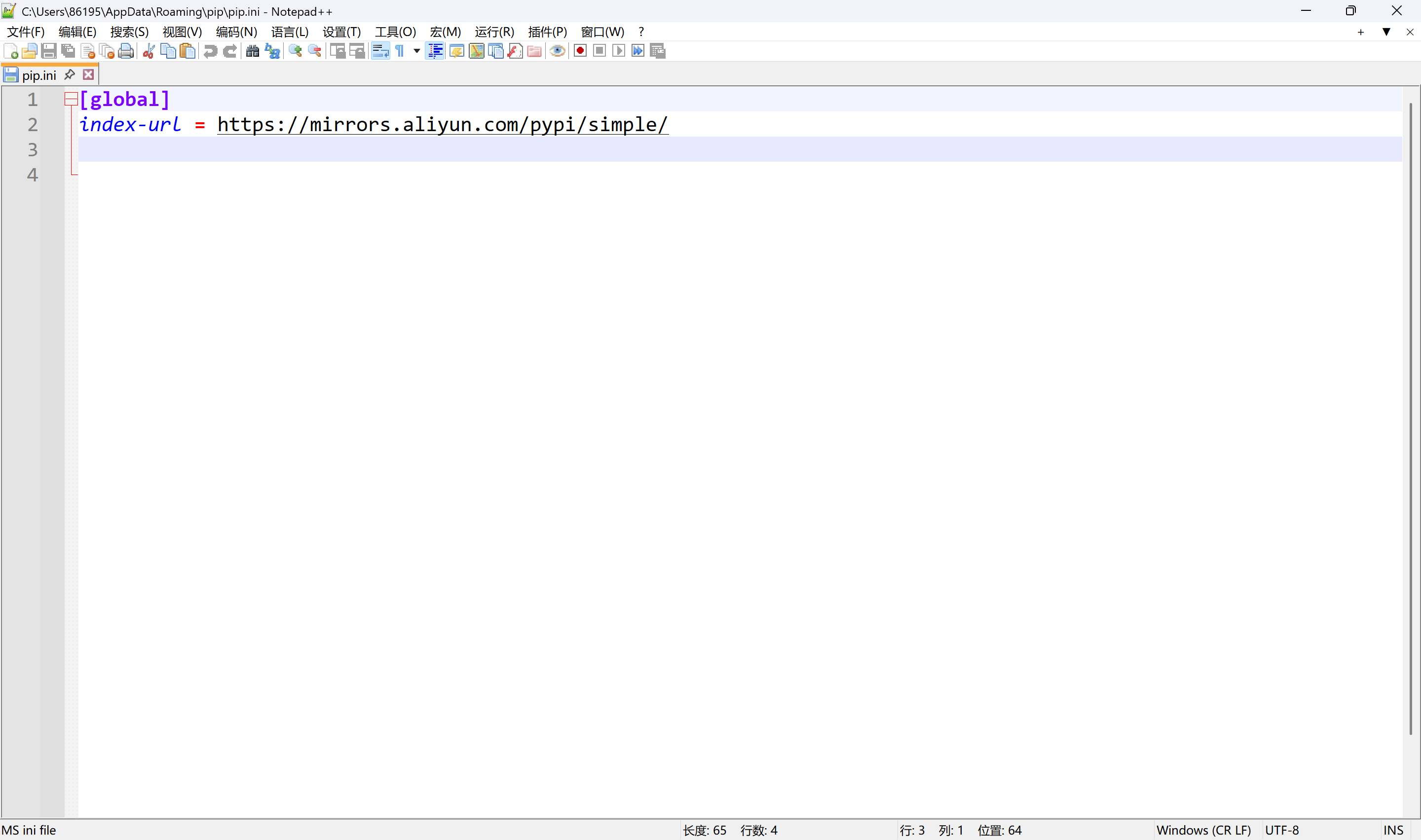 打开输出的这个文件路径看一下【C:\Users\86195\AppData\Roaming\pip\pip.ini】