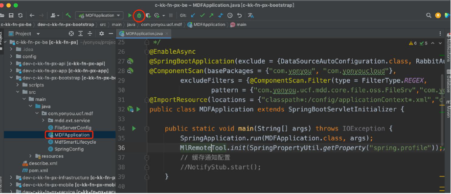 2、在bootstrap 工程下,找到MDFApplication.java 类,添加到Spring Boot 工程启动类,