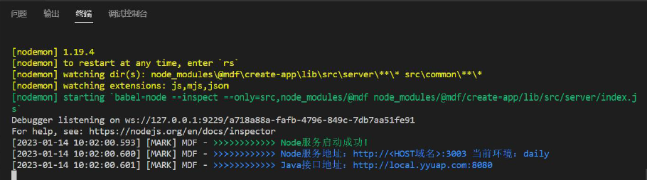 启动成功,node 中间层终端会提示相关服务地址,如下图: