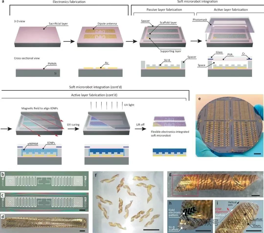图1:用于远程形状传感微型机器人的柔性电子和软微型机器人的集成
