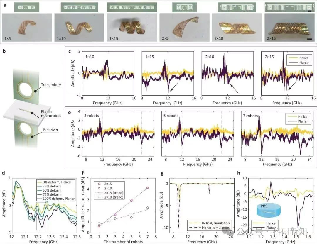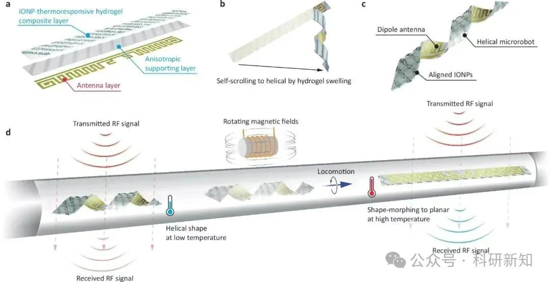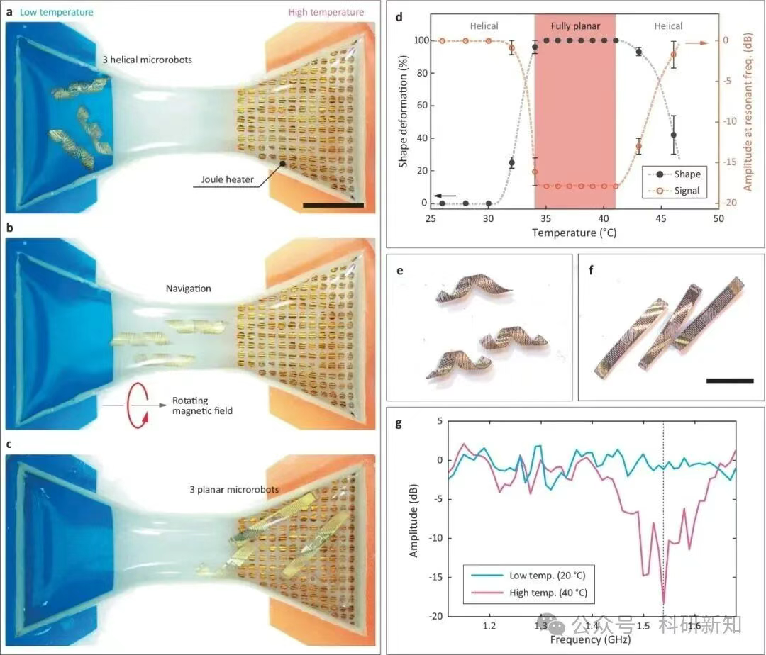 小尺度/微型机器人中的远程通信为增强其能力提供了强大途径,可通过引入了状态监测、多智能体协作和自主操作等可能性。将常见的远程通信工具(例如天线)集成到微型机器人中,使用传统设计和制造技术具有挑战性。文中提出一种概念,将形状可重构的软体微型机器人与柔性电子器件相结合,利用其弹性力学特性实现远程通信。这种方法基于光刻工艺,可扩展并适用于各种传感应用。作为概念验证,我们展示了一款微型机器人,其将热响应磁性水凝胶、各向异性支撑结构和柔性偶极天线集成到一个连贯的三层设计中。该微型机器人能够在低温下从螺旋形态变形为高温下的平面形态。这种形状转变可以通过外部无线通信接收器远程检测,从而实现形态状态识别和环境温度传感。此外,我们证明了多个微型机器人的集体行为通过放大信号增强了识别性能。这一概念代表了智能材料与柔性电子协同工程的重要进展,展示了一种通过集成环境监测、磁导航和远程信号传递来实现微型机器人具身智能的途径。
