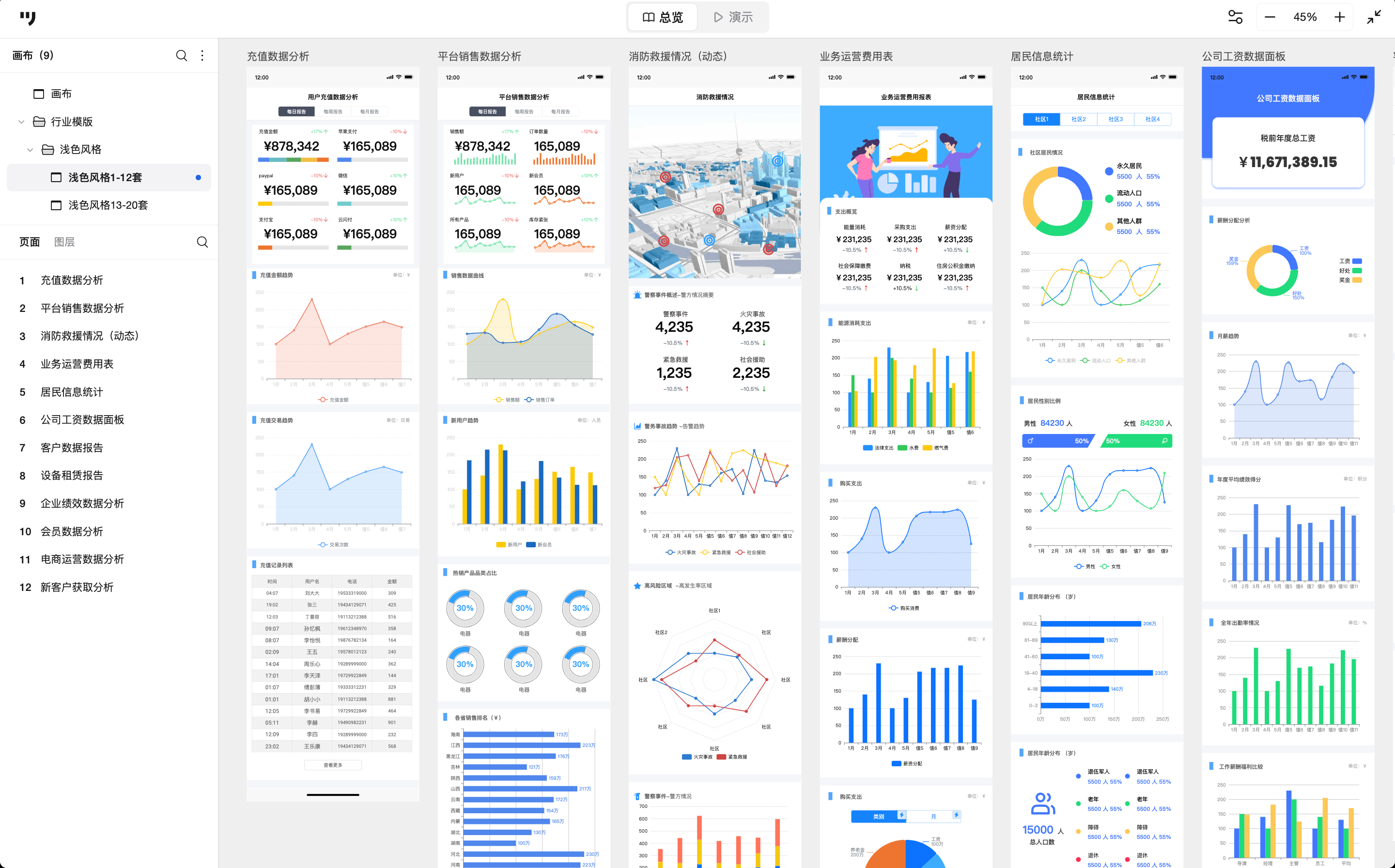 这是浅色移动端数据分析的案例,常见于B端管理类App或SaaS工具,强调清晰和效率。例如充值数据分析、平台销售数据分析、消防救援动态、业务运营费用、居民信息统计、公司工资数据面板等等。