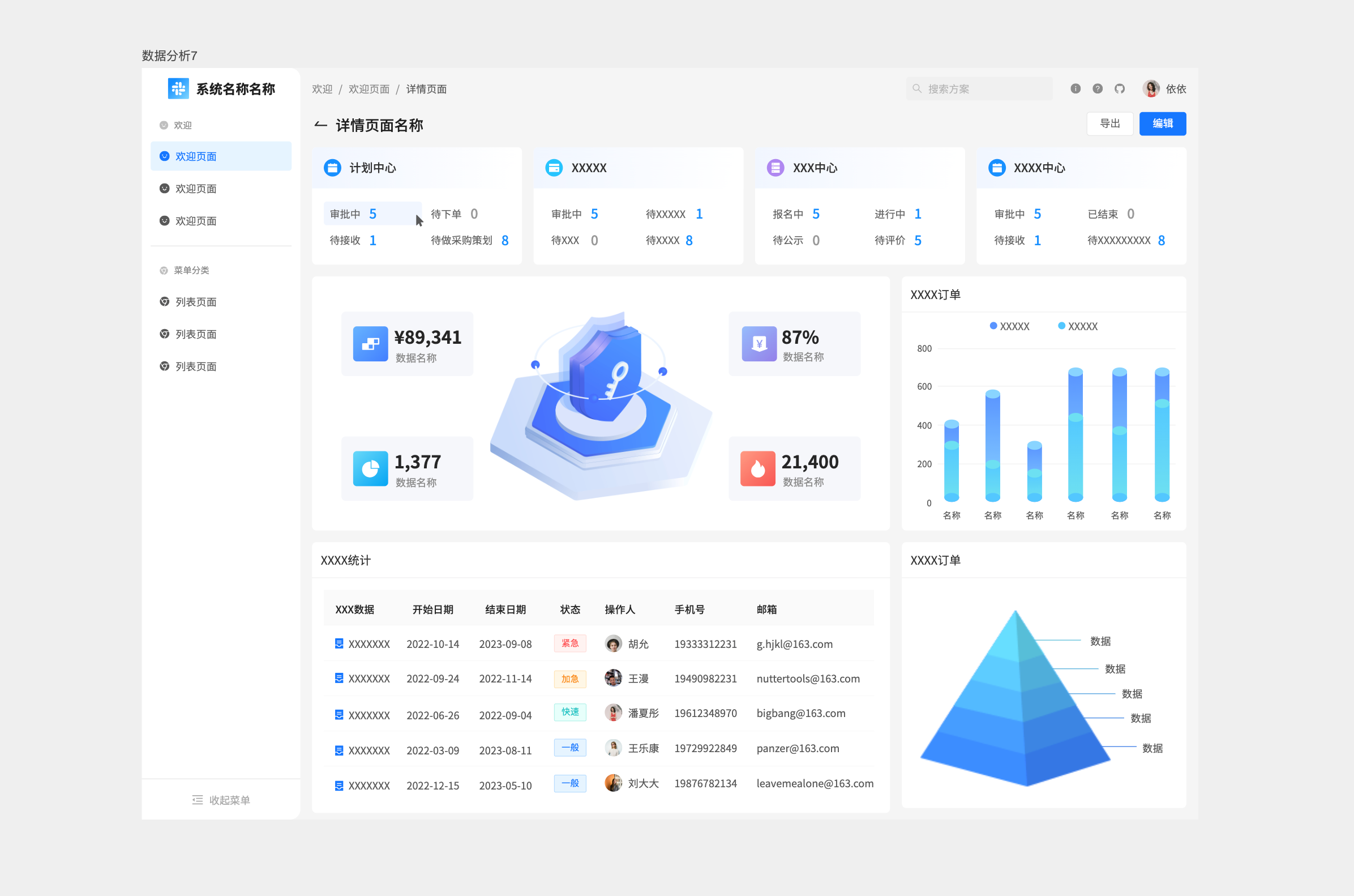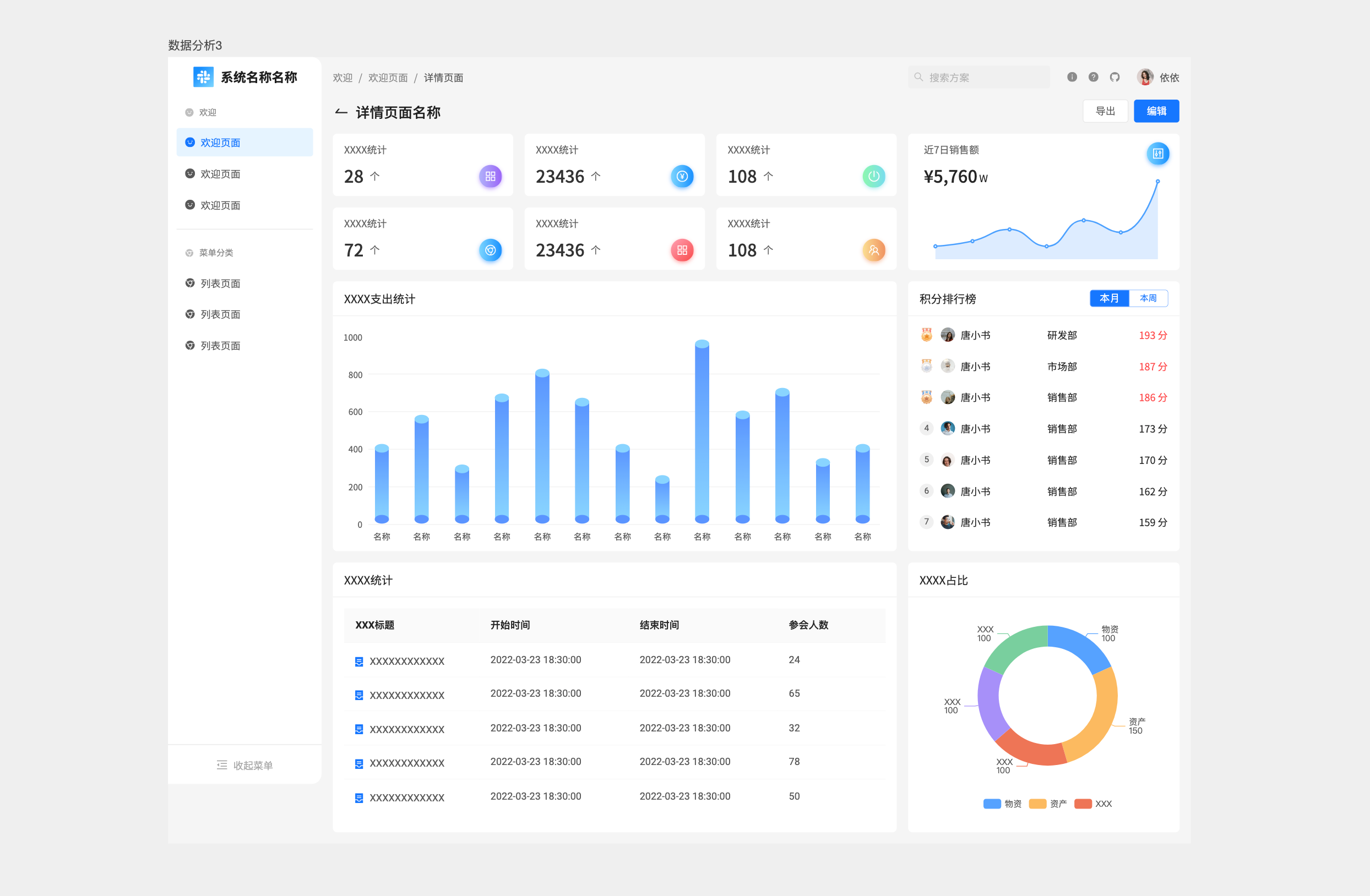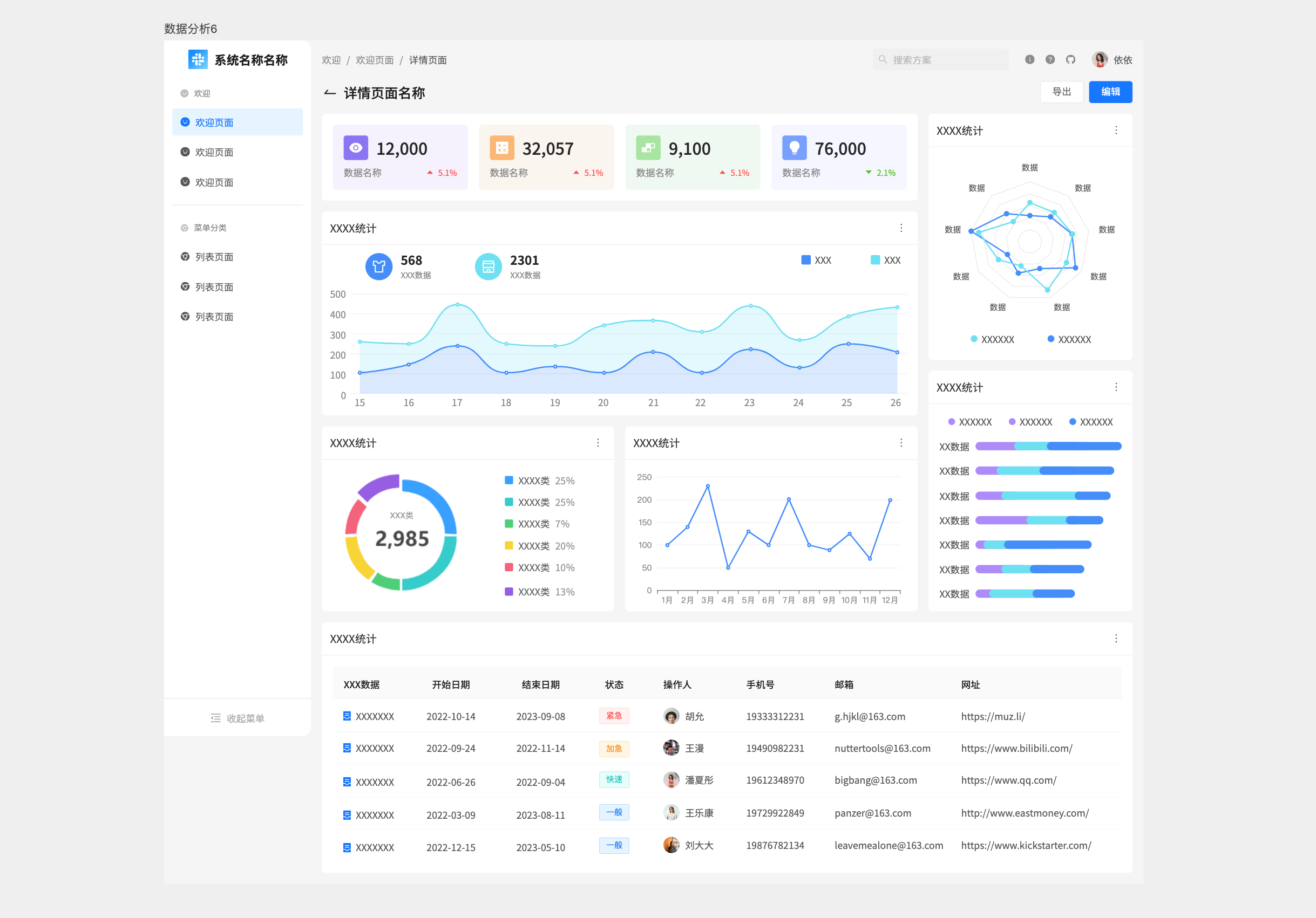 这类数据分析页面应该是做运营数据中心的统计,可以用作APP运营后台、SaaS产品活跃度分析、全渠道营销数据复盘等综合统计报表。