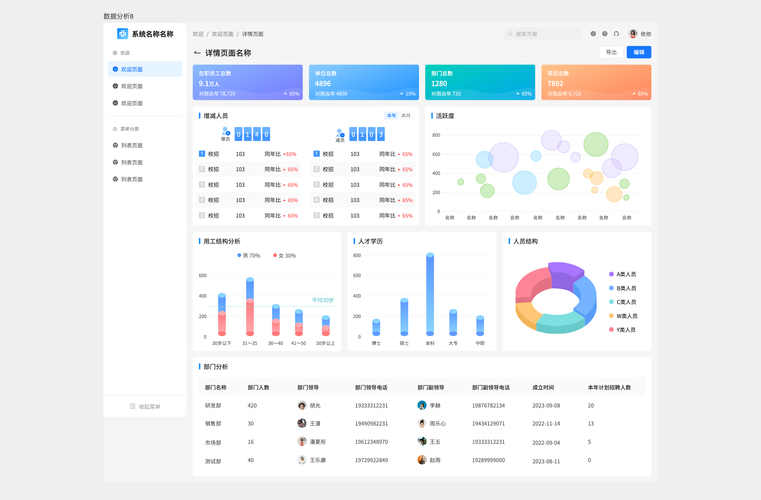 - 中下部分析图:分别是用工结构分析,区分男女比例;人才学历分析柱状图:博士/硕士/本科/大专;人员结构图,A/B/C类人员的南丁格尔玫瑰图饼图。