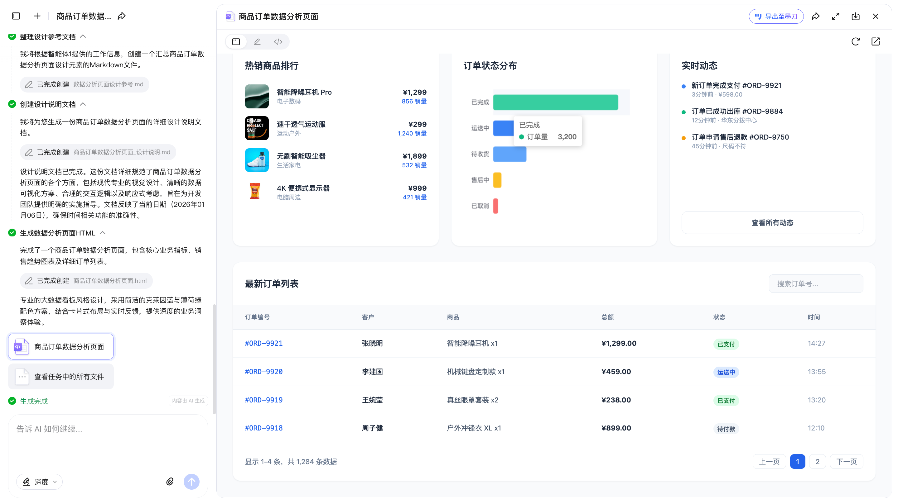 从原型评审的角度来看,这个页面可以支撑第一次需求评估。它的顶部通过四个核心数据卡片(订单数、销售额等)配合红绿涨跌幅,快速传达当前经营状态;中部用面积折线图展示时间维度的流量变化,同时通过环形图拆解品类结构,视觉重心清晰;底部则下钻到「热销商品排行」和「实时动态」,为运营人员提供可执行的分析线索。