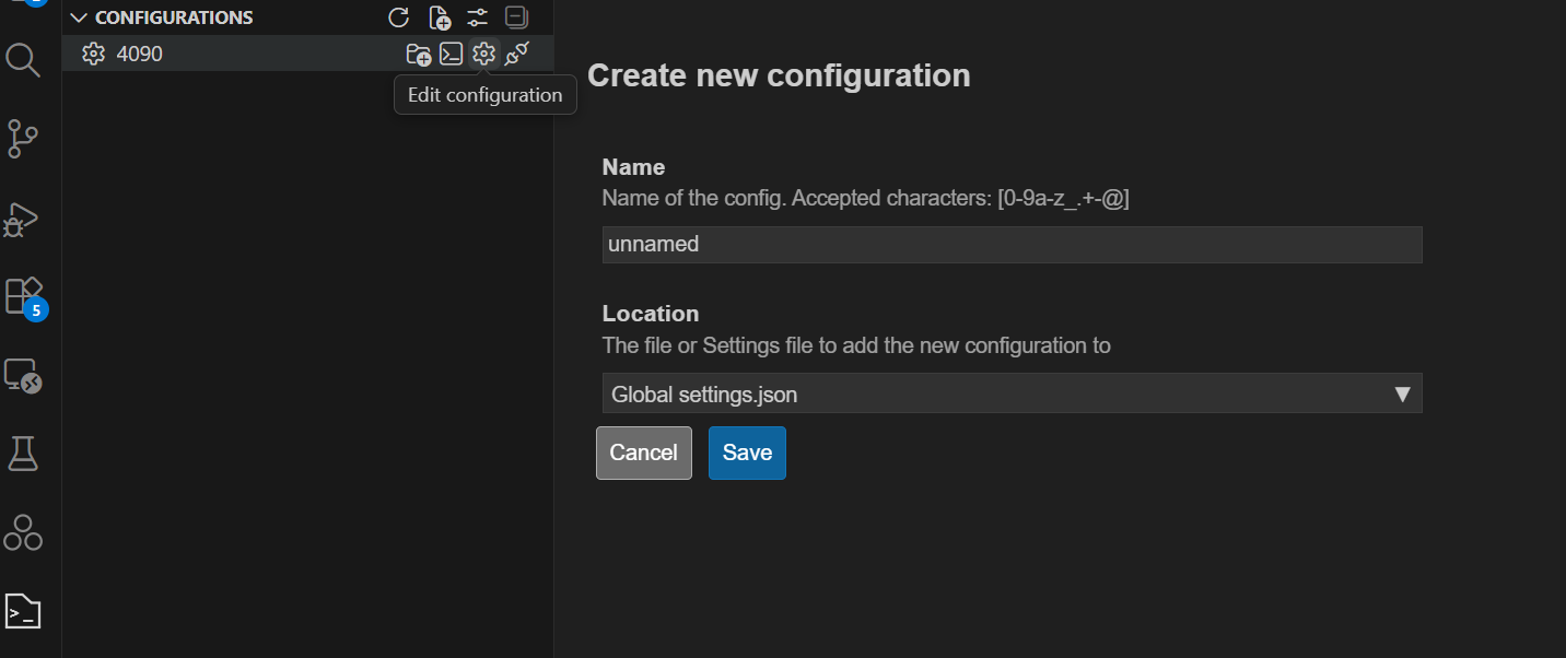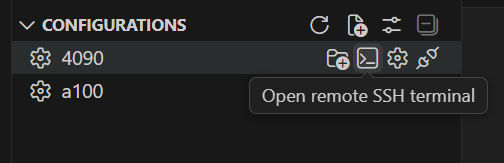点击ssh-fs插件,找到上图部分,比如4090服务器,对应有4个图标。第一个图标是连接服务器文件夹(Add as workplace folder),第二个图标是打开远程终端(Open remote SSH terminal)。点击这两个就行。