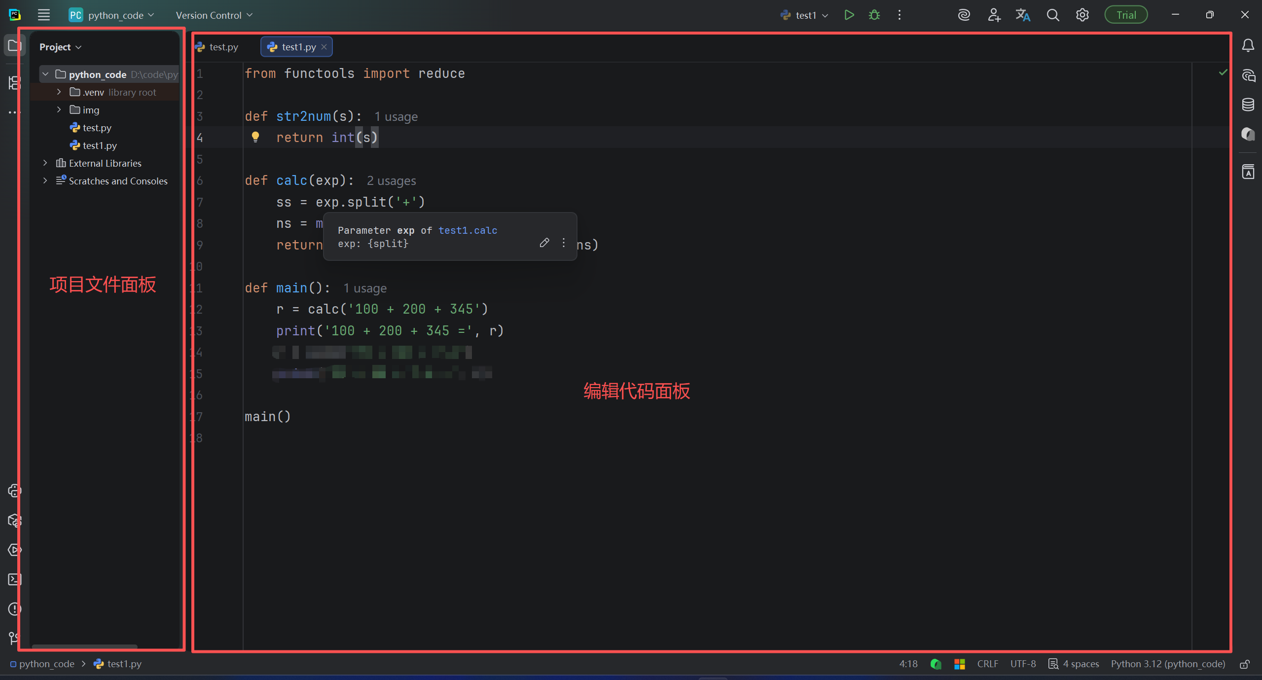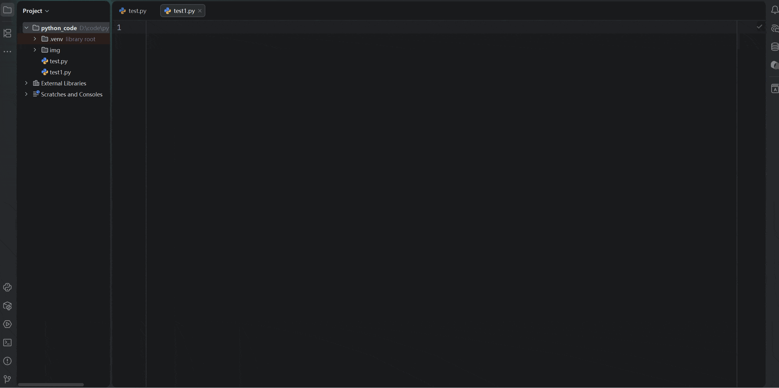 通常在Pycharm中,左侧面板通常是存放项目文件区,右侧是编辑代码区,如下图所示:
