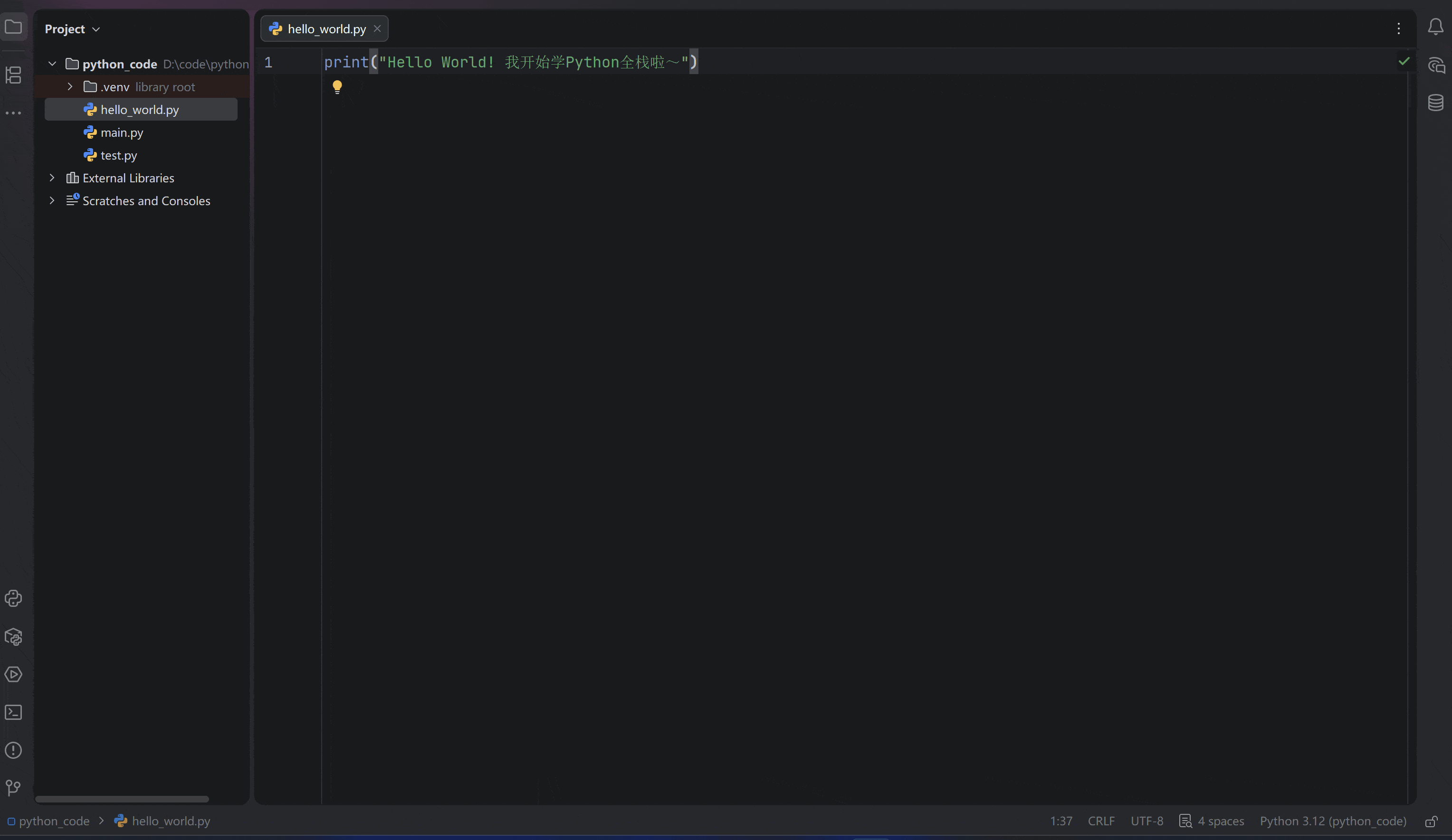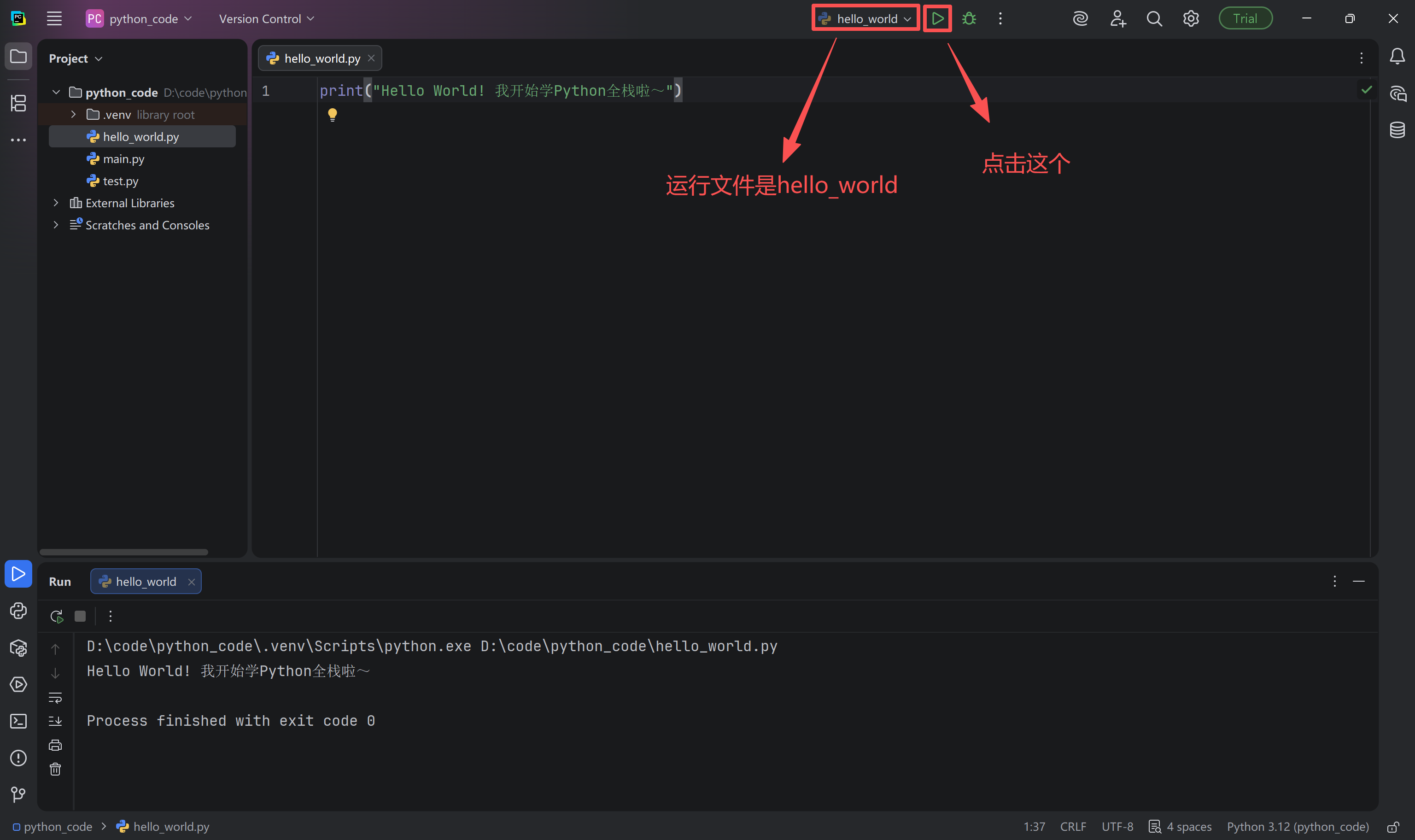 - 点击文件编辑区右上角的绿色三角按钮(「Run 'hello_world'」);