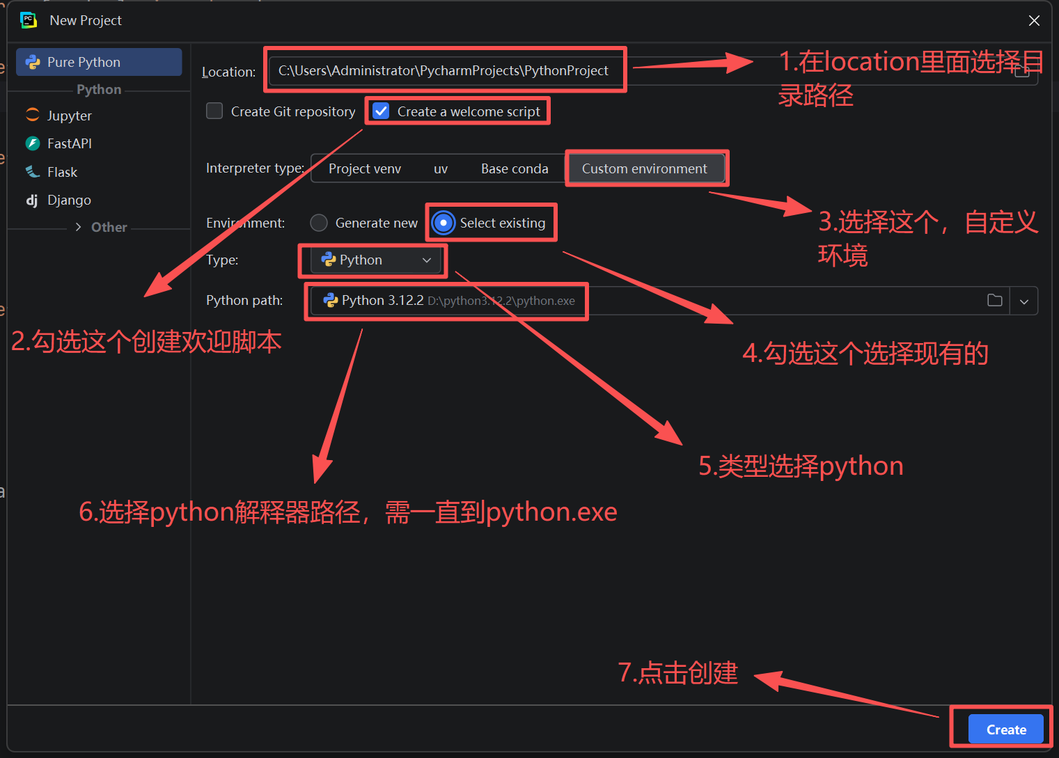 点击「New Project」创建新项目,在「Location」中选择项目保存路径(比如D:\PythonProjects\FirstProject),由于大家还是初学者,所以这里就先不给大家上难度了,所以这里先不使用虚拟环境,虚拟环境的内容在后面的文章会进行讲解,直接在「Custom environment」中选择咱们之前安装好的Python.exe路径(比如D:\Python39\python.exe),最后点击「Create」完成项目创建,具体步骤如下图所示: