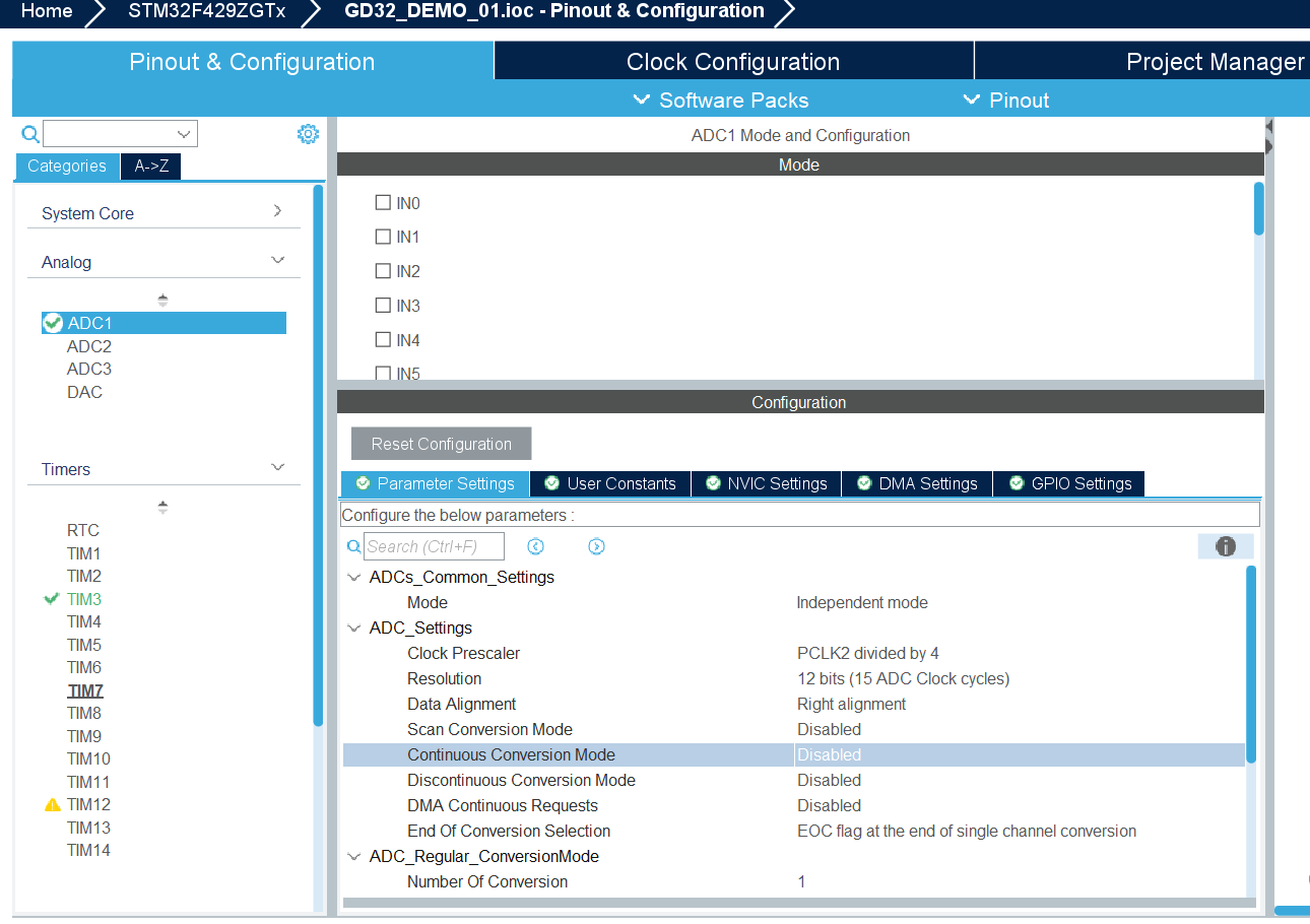 - 转换模式根据应用选择:需要单次读取用 Single ;需要连续采样(尤其配合DMA)用 Continuous。