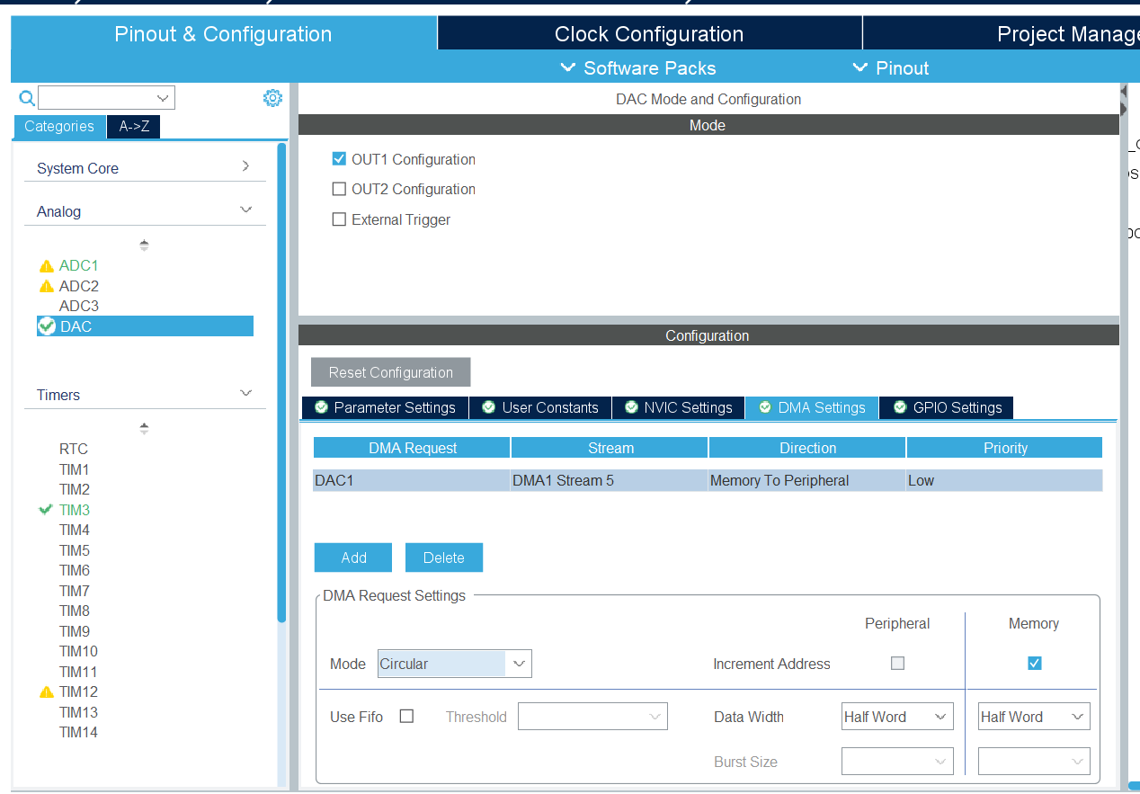 - Memory 通常也设置为 Half Word (16位),以匹配我们 `uint16_t SineWave[]` 数组的元素大小。