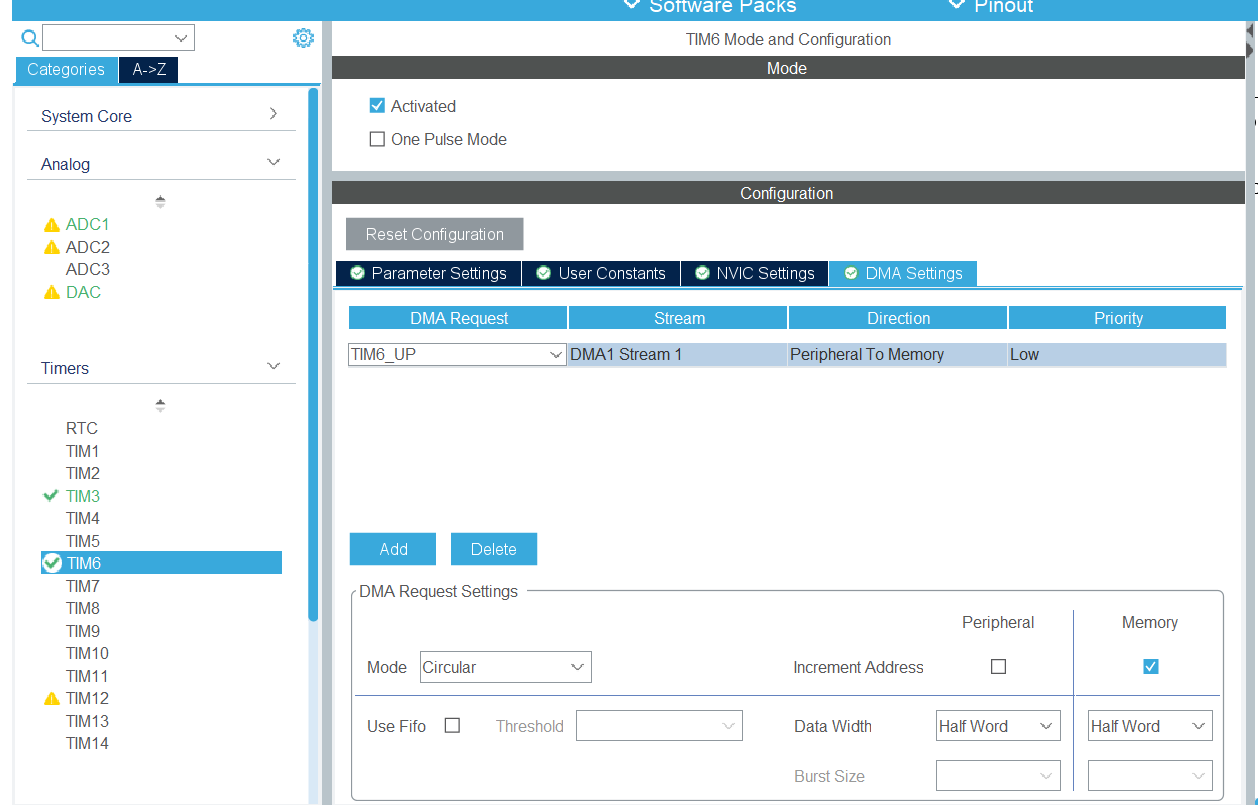 DMA 数据宽度说明: 注意这里与 ADC 的 DMA 配置不同。因为 DAC 数据寄存器通常只需要写入有效数据位(如 12 位),并且我们的查找表是 uint16_t 类型,所以 DMA 的外设和内存宽度都设置为 Half Word (16位) 是最自然、最高效的配置。