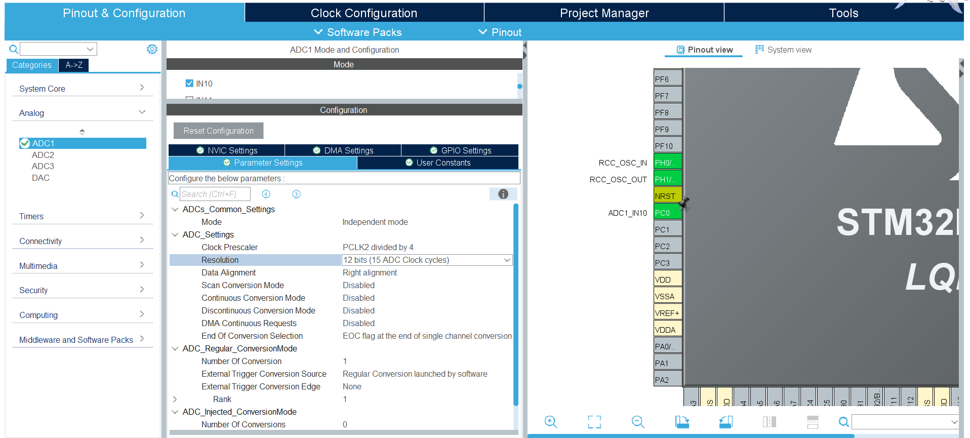 查原理图,配置相应引脚为ACD功能,在CubeMax中Analog中配置ADC
