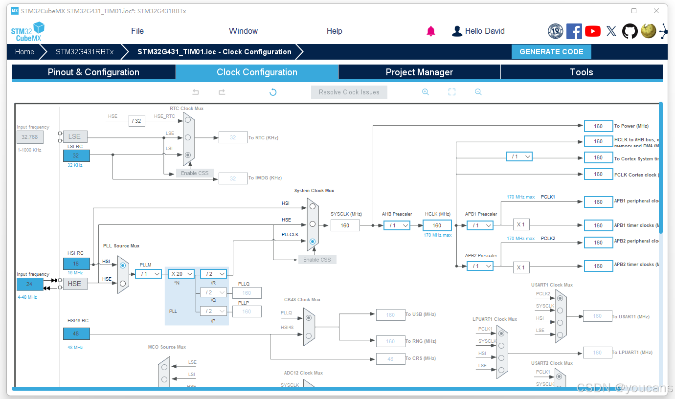 在 Clock Configuration 视图进行时钟配置。如下图所示,APB2 定时器时钟为160MHz(TIM1挂载在APB2总线上)。