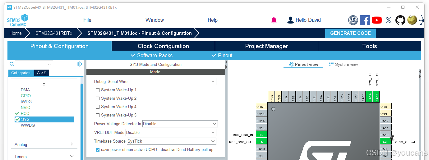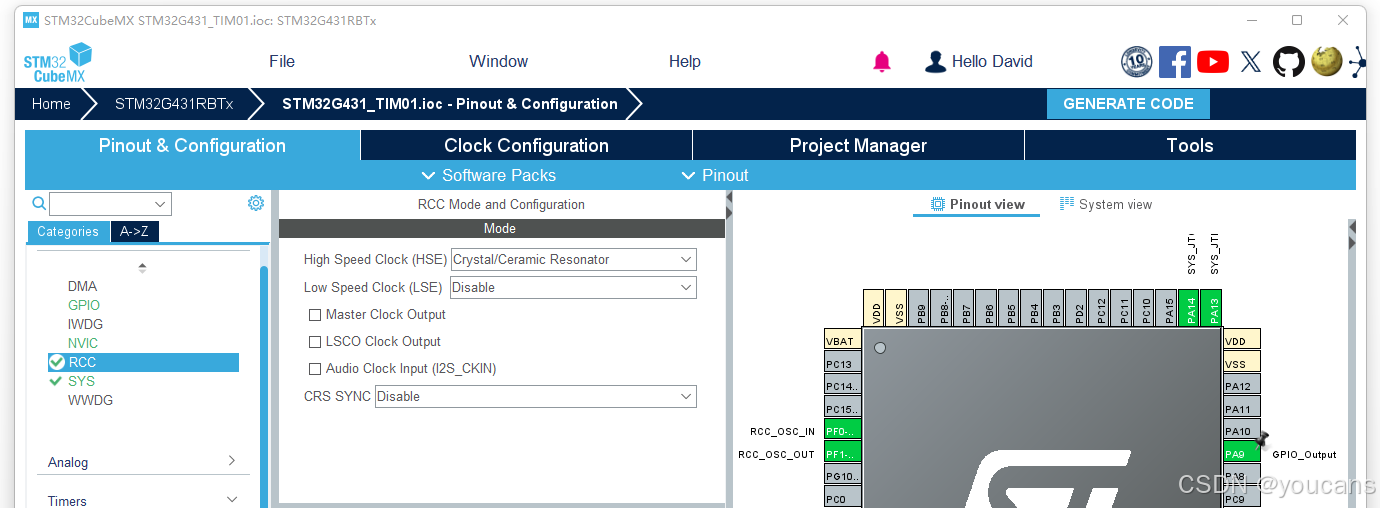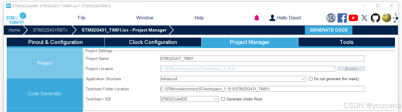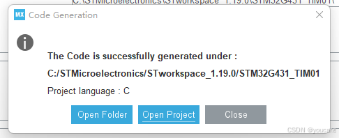 点击右上角 "GENERATE CODE" ,将自动生成带 .ioc 的工程文件 "STM32G431_TIM01.ioc"