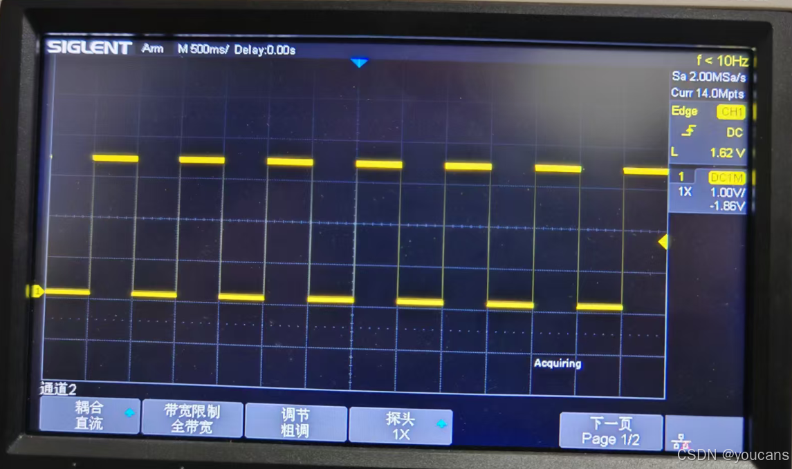- 高电平持续时间:500ms,低电平持续时间:500ms;