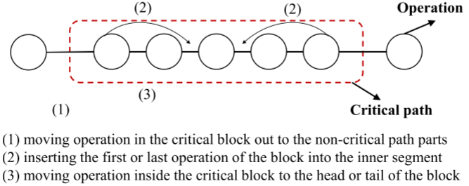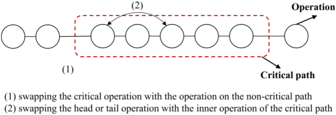 本文将关键路径方法扩展至同时包含机器加工与 AGV 运输任务的 IPPS_T 问题,基于扩展关键路径和关键块提出了改进的邻域搜索与变异策略。通过对关键路径上的操作与非关键操作进行交换,加强对 makespan 的有效扰动,并进一步针对 AGV 关键任务块设计了可行的交换变异方法。