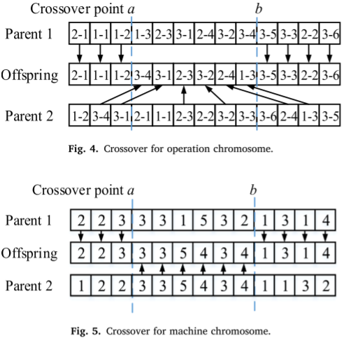本文采用随机方式对各类染色体进行初始化,并通过锦标赛选择机制以一定概率保留适应度较优个体,从而兼顾进化压力与种群多样性。交叉操作中,工序染色体采用保持相对顺序的两点交叉策略,其余染色体基于基因位置对应关系进行两点交叉,以确保解的可行性并实现有效遗传重组。
