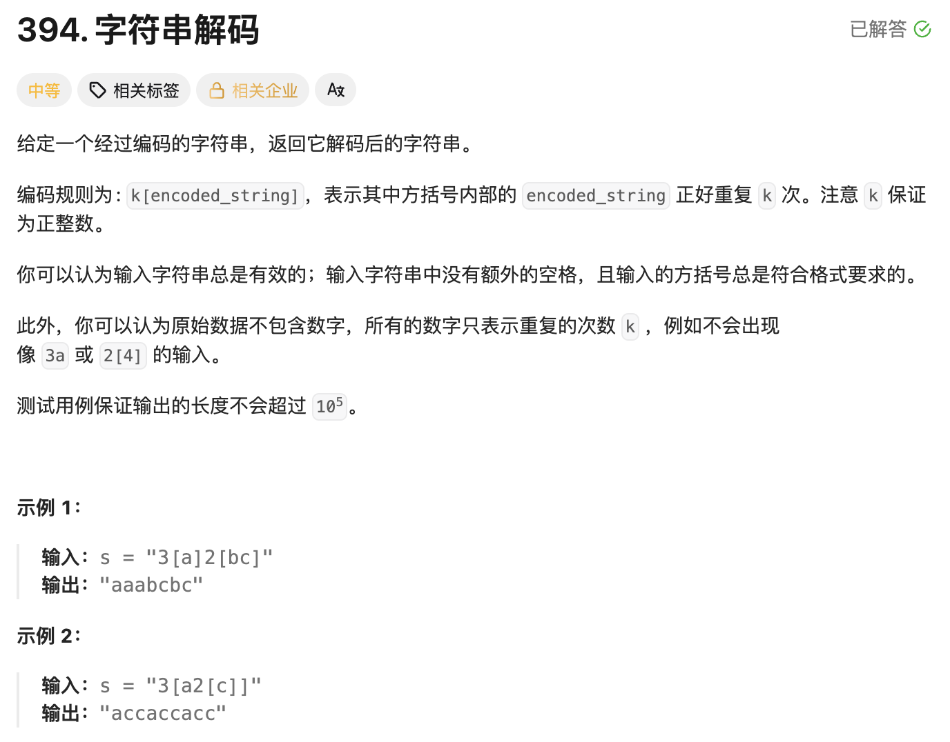 遇到 ]:说明括号内部拼完了,此时 curStr 就是 这一层括号内的结果,要拿它去重复 times 次,并接回上一层前缀。