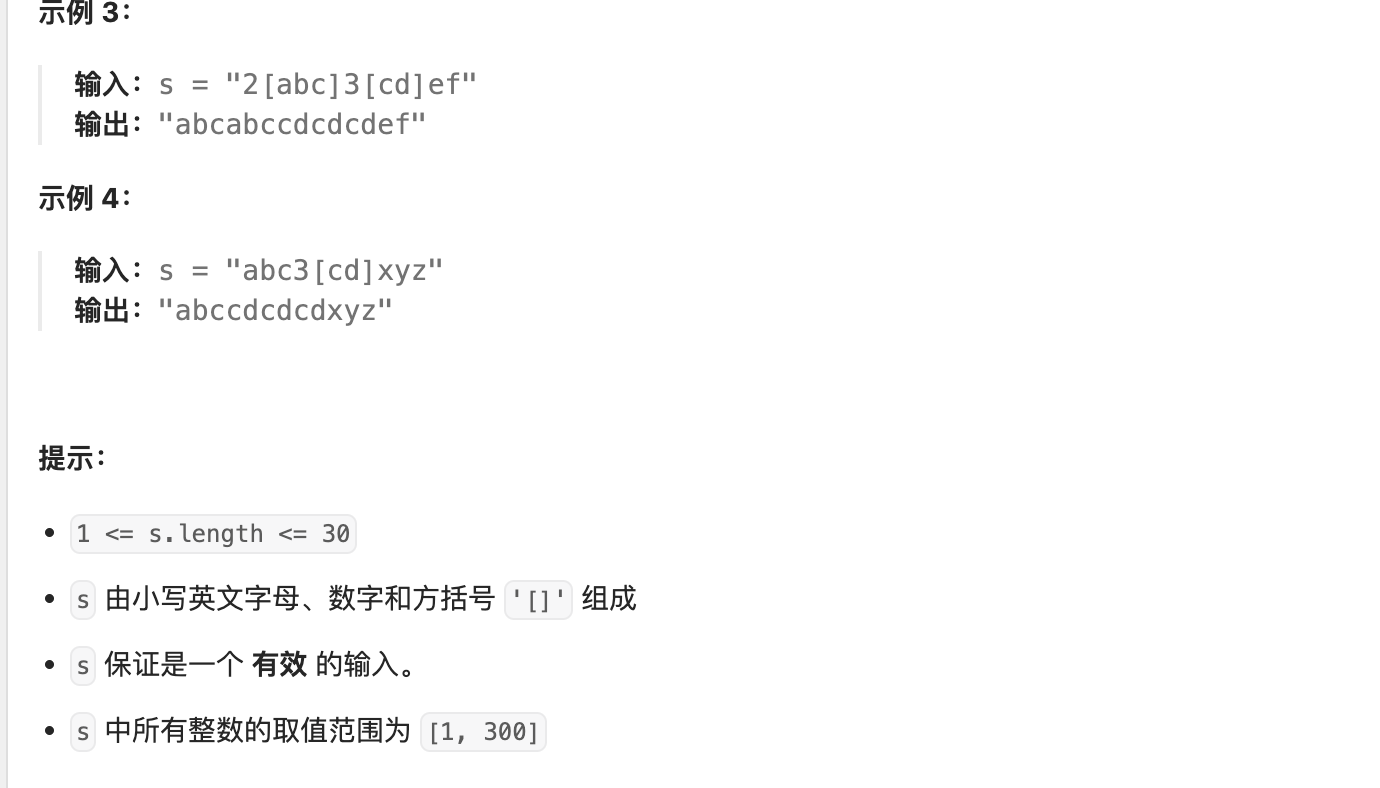 //5.如果是右括号,就进行解码。得到当前字符串就是要重复的次数,也就是[]前的数字