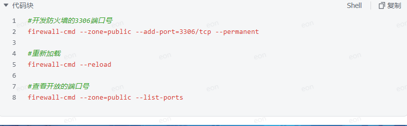 #开发防火墙的3306端口号 firewall-cmd --zone=public --add-port=3306/tcp --permanent