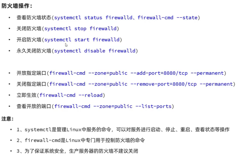 Linux系统安装完毕后,系统启动时,防火墙自动启动,防火墙拦截了所有端口的访问。接下来我们就需要学习一下,如何操作防火墙,具体指令如下: