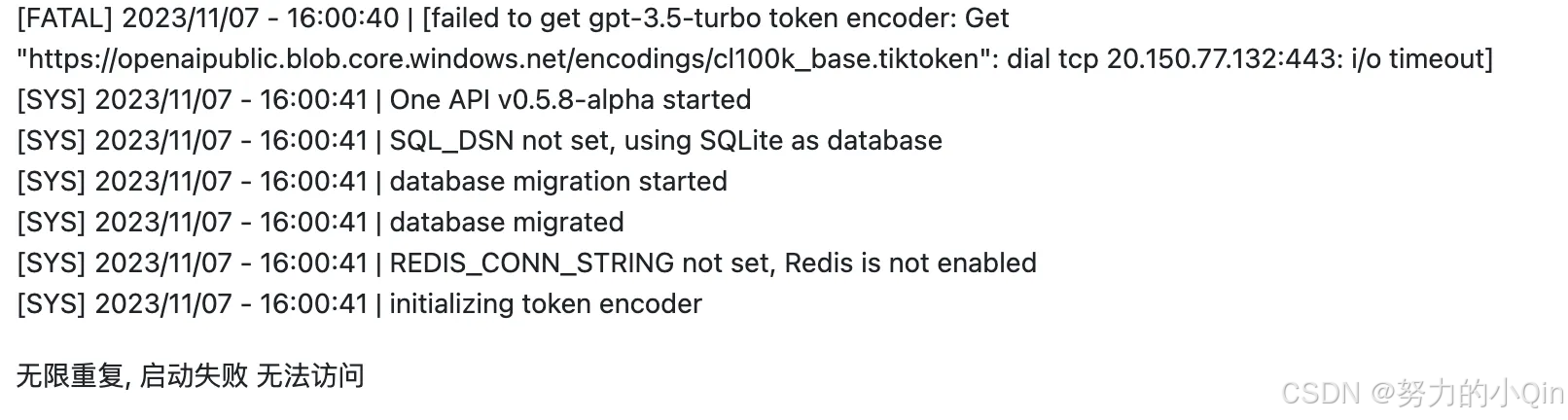 此时戏剧性的一幕出现了,one-api 容器疯狂报错,错误信息如下: