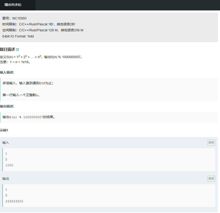 - 定义S(n)=12+22+...+n2,输出S(n)mod1e9+7;