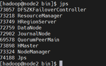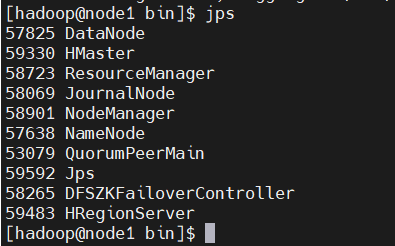 node1(主Master):HMaster、RegionServer、QuorumPeerMain(ZK)、NameNode、ResourceManager