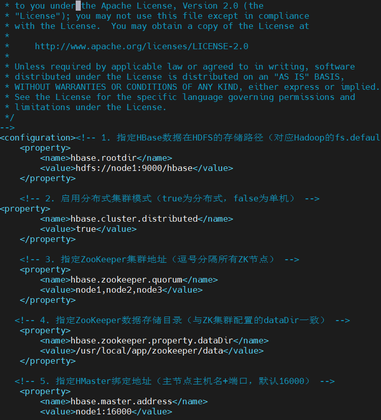 - 核心配置:hbase-site.xml中的hbase.rootdir和hbase.zookeeper.quorum是必对参数