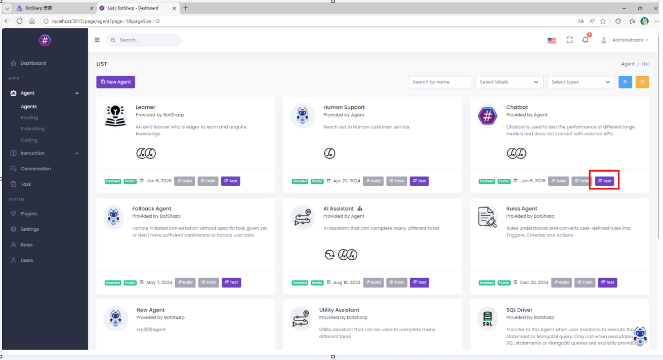 然后打开Agent代理的Chatbot,如下图: