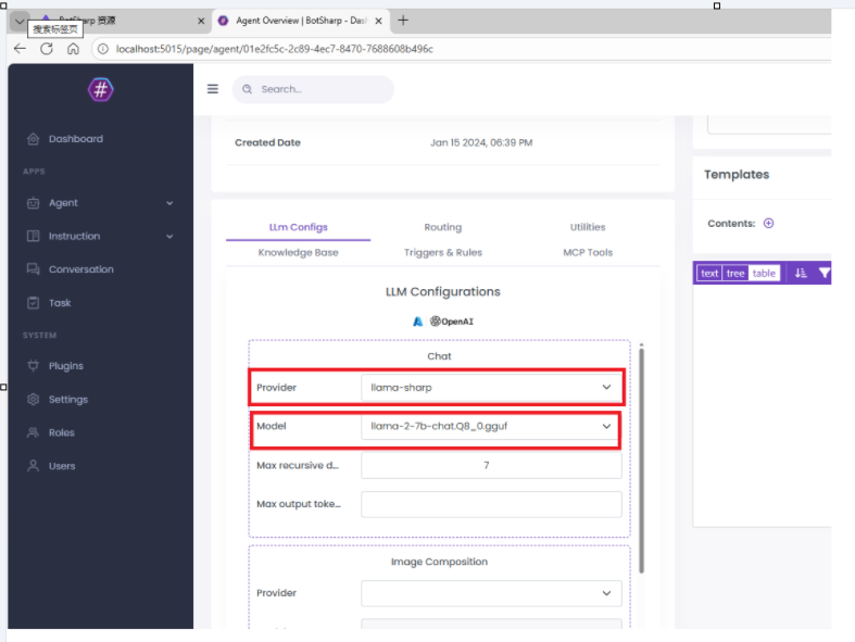 然后选择llama-sharp,接着选择我们的模型llama-2-7b-chat.Q8_0.gguf,然后保存,回到Chatbot