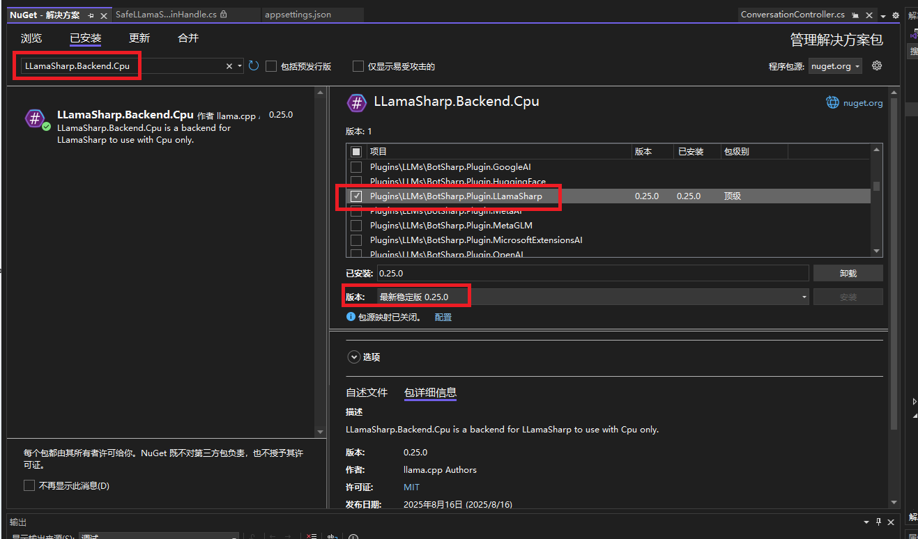 6 利用nuget安装LLamaSharp.Backend.Cpu到项目中BotSharp.Plugin.LLamaSharp.csproj,版本选择0.25.0,如下图: