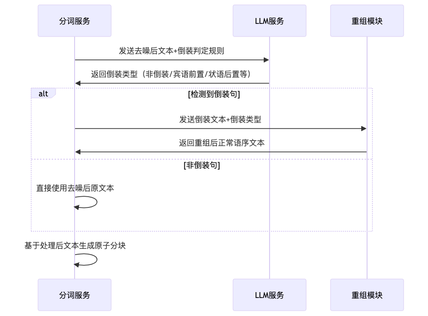 在某些业务场景中,文本可能存在倒装句现象,会影响语义理解和检索效果。我们采用 LLM 辅助的方式识别和重组倒装句: