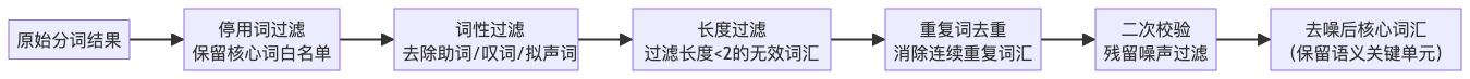 - 有效去噪:过滤掉停用词、无意义词性词汇等噪声,保留核心语义单元