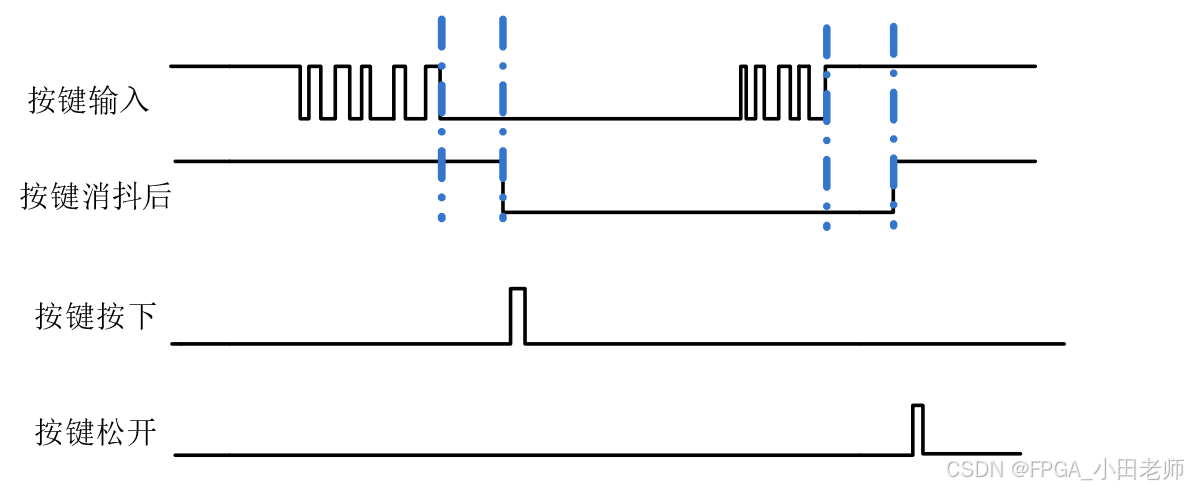 按键的消抖,是指按键在闭合或松开的瞬间伴随着一连串的抖动,这样的抖动将直接影响设计系统的稳定性, 降低响应灵敏度。因此,必须对抖动进行处理,即消除抖动的影响。