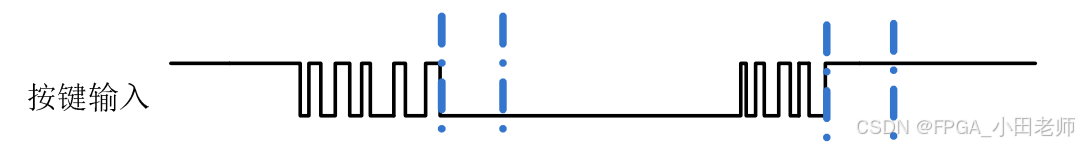 这是因为,按键在按下或松开的时候,按键输入值是又抖动的,无论你按下去的时候多么的平稳,都会存在这个抖动,就像这样子,所以我们必须进行消抖。