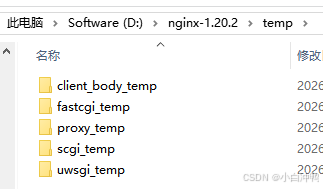 在D:\nginx-1.20.2目录下新建temp文件夹,然后在其中新建一下文件夹: