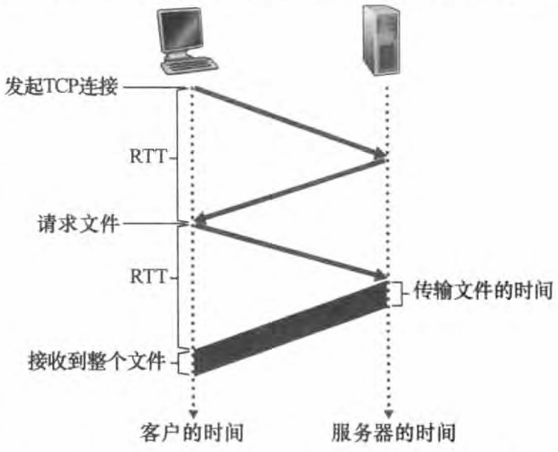 我们来简单估算一下从客户请求HTML基本文件起到该客户收到整个文件止所花费的时间。 为此,我们给出往返时间 (Round-Trip Time, RTT) 的定义,该时间是指一个分组从客户到服务器然后再返回客户所花费的时间。 RTT包括分组传播时延、分组在中间路由器和交换机上的排队时延以及分组处理时延。 现在考虑当用户点击超链接时会发生什么现象。