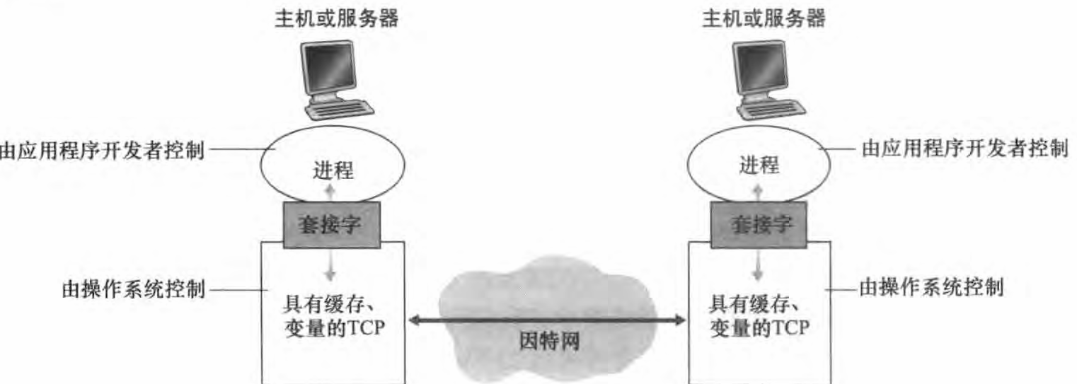 进程通过一个称为套接字 (socket) 的软件接口向网络发送报文和从网络接收报文。如下图所示,两个经过因特网通信的进程(图中假定该进程使用的运输层协议是TCP协议)。 套接字是一台主机内应用层与运输层之间的接口。 该套接字可称为应用程序和网络之间的应用程序编程接口 (Application Programming Interface, API) 。应用程序开发者可以控制套接字在应用层端的一切,但是对该套接字的运输层端几乎没有控制权。 应用程序开发者对于运输层的控制仅限有: 1.选择运输层协议; 2.也许能设定几个运输层参数,如最大缓存和最大报文段长度等。一旦应用程序开发者选择了一个运输层协议(如果可供选择的话),则应用程序就建立在由该协议提供的运输层服务之上。