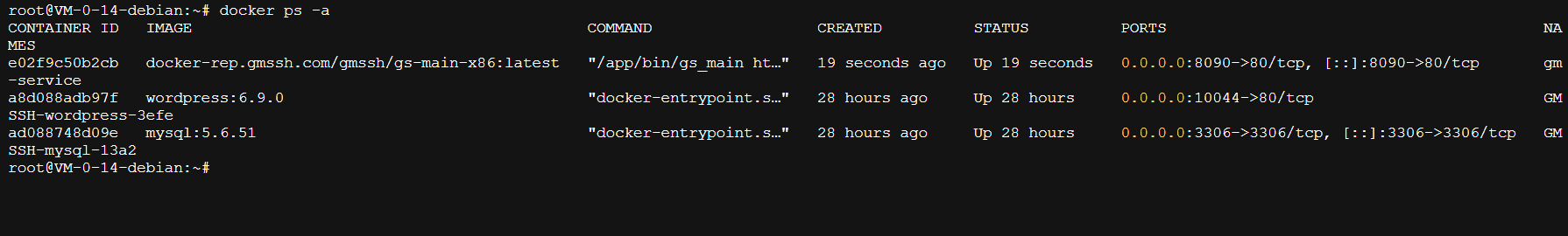 通过 docker ps -a 命令可以确认容器的状态。如上图所示,名为 gm-service 的容器正在运行,且其内部的80端口已成功映射到宿主机的8090端口。这意味着用户可以通过浏览器访问服务器IP加8090端口来打开管理后台。