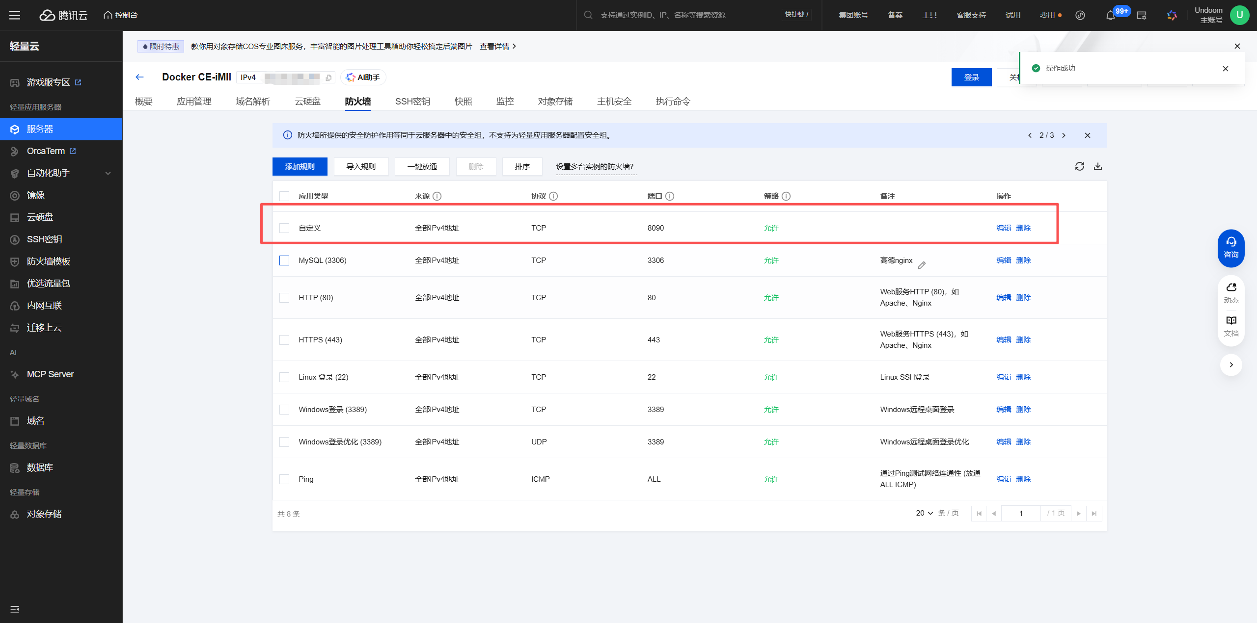 在上图中,通过服务器厂商的安全组控制台手动添加了一条入站规则,协议为TCP,端口范围设置为8090,策略为允许。这一步是确保外部网络流量能够触达容器服务的关键。