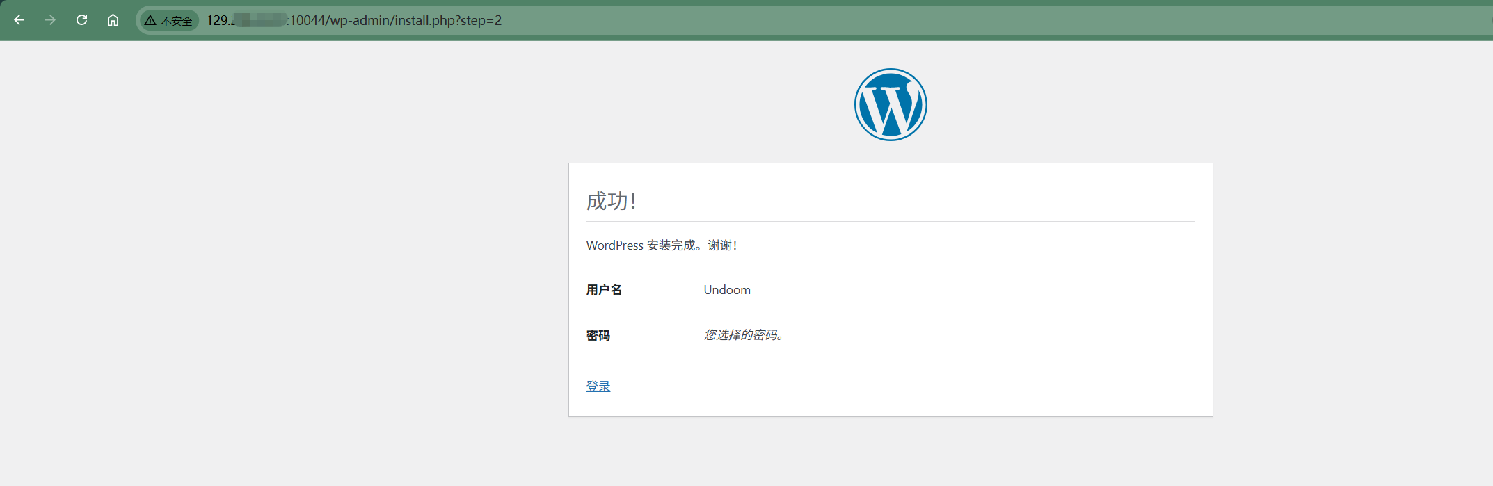 片刻后,系统提示WordPress安装成功。上图展示了安装完成的反馈界面。