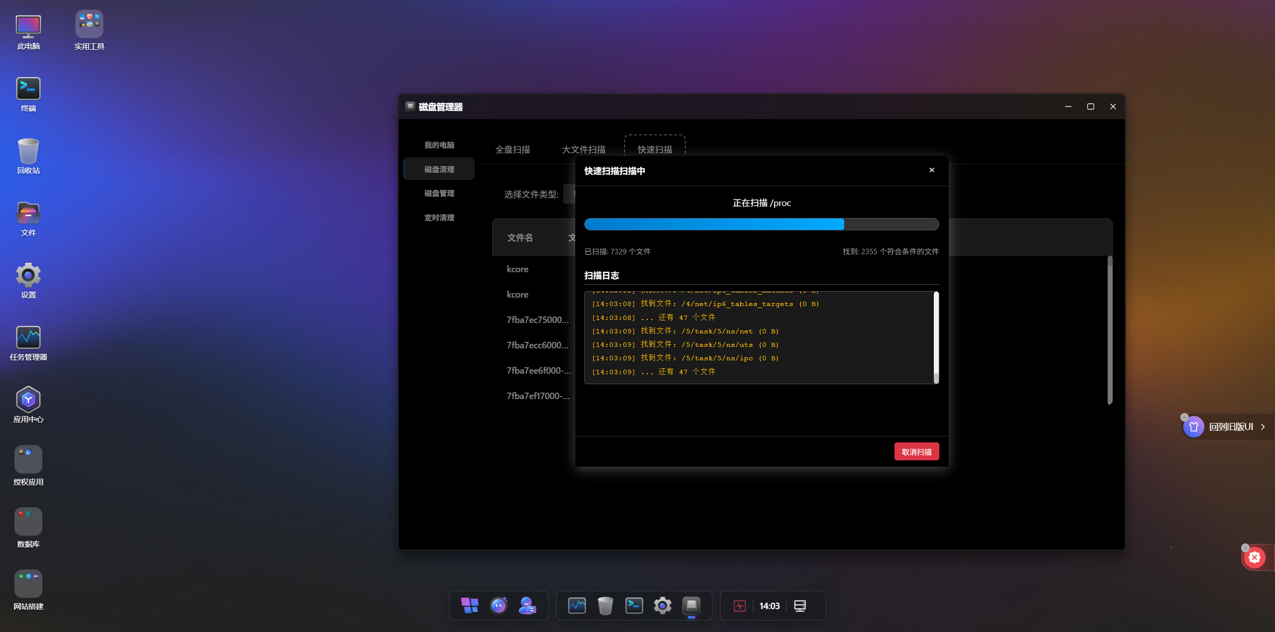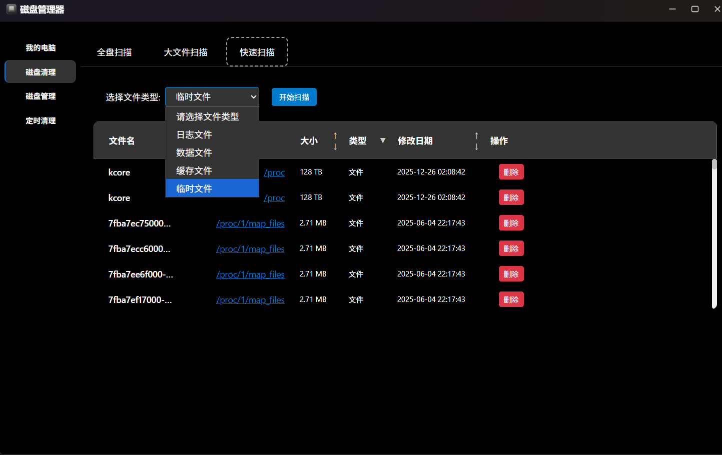 在该工具中,用户可以勾选特定的文件类型进行全盘扫描。上图展示了扫描结果,文件按大小进行降序排列,并标注了路径。运维人员可以针对性地点击删除,释放空间。