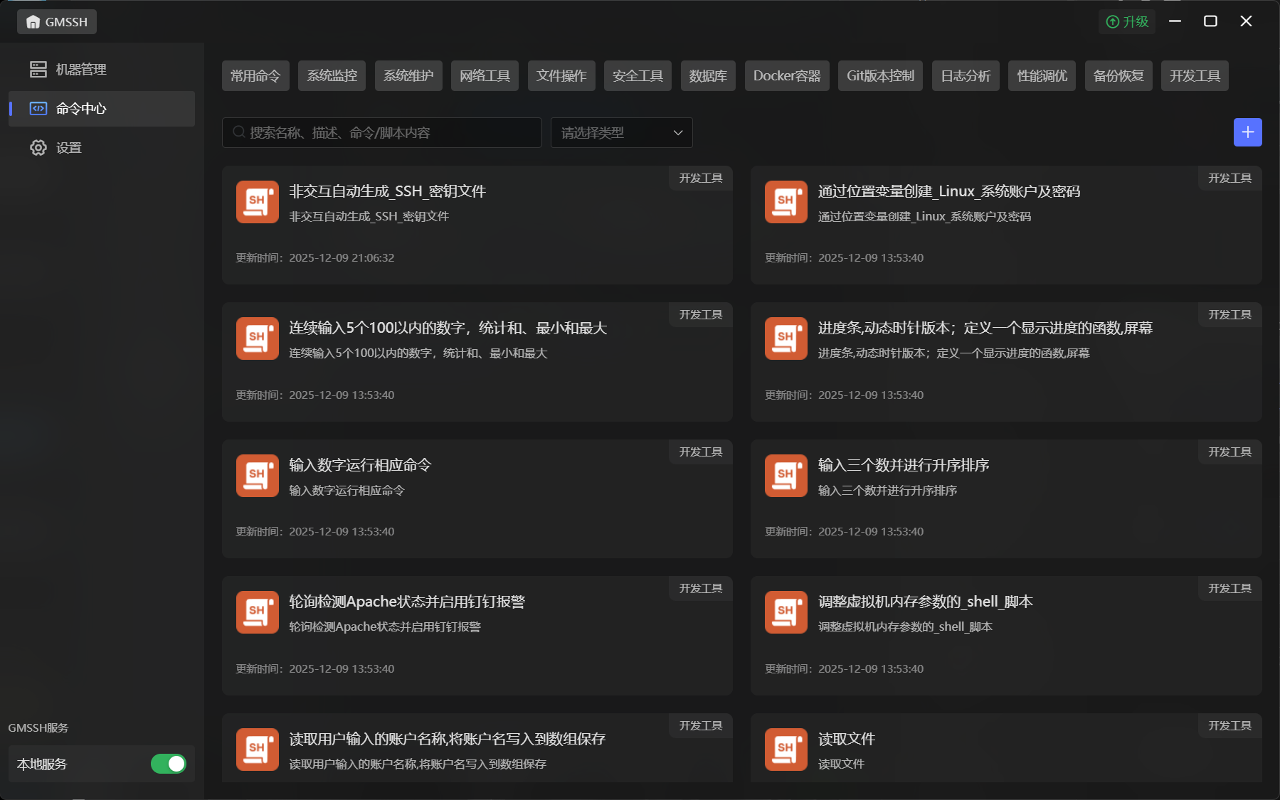 为了真正实现零基础运维,GMSSH内置了强大的命令中心。上图清晰地展示了命令中心内涵盖的各类开发者工具集。该模块不仅包含了系统监控与基础维护指令,还深度集成了针对Docker容器的生命周期管理以及Git代码版本控制的相关操作。运维人员无需在终端逐字输入复杂的长命令,通过预设的脚本库即可一键执行高频任务。这种将经验代码化、图形化的设计,为个人博客的快速迭代与服务器的日常巡检提供了可靠的技术支撑。