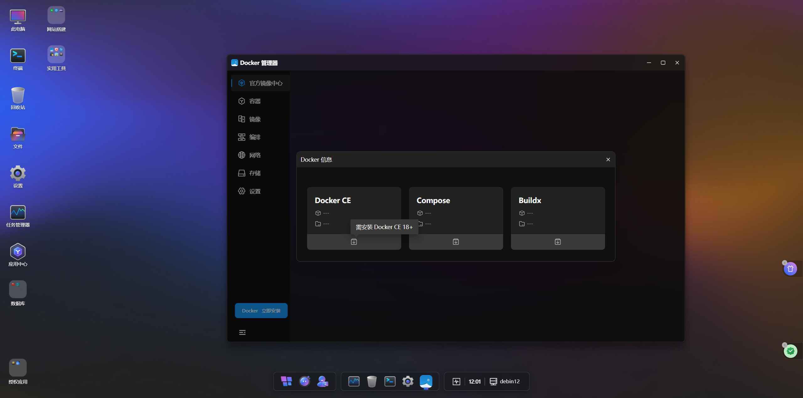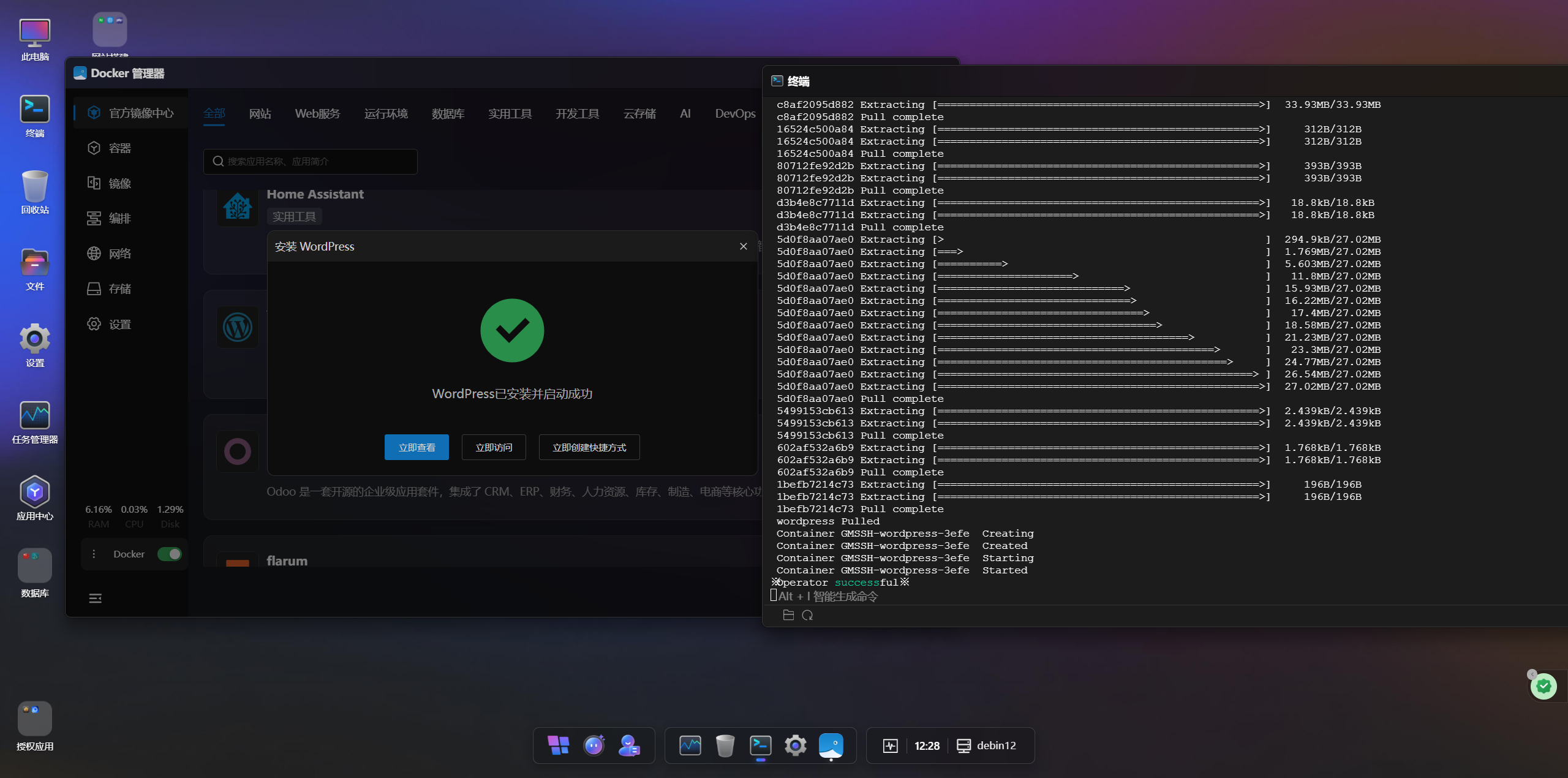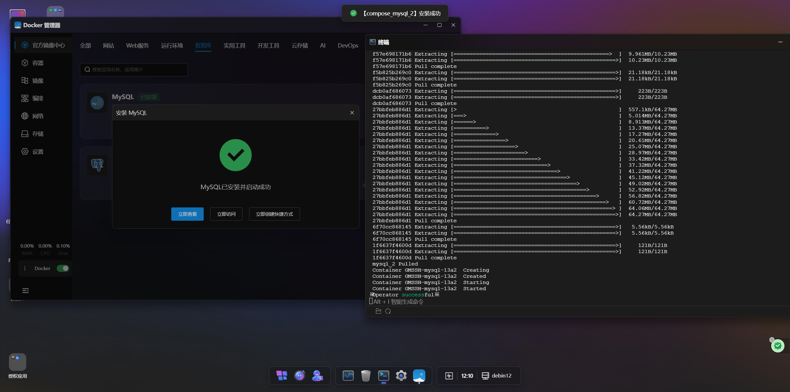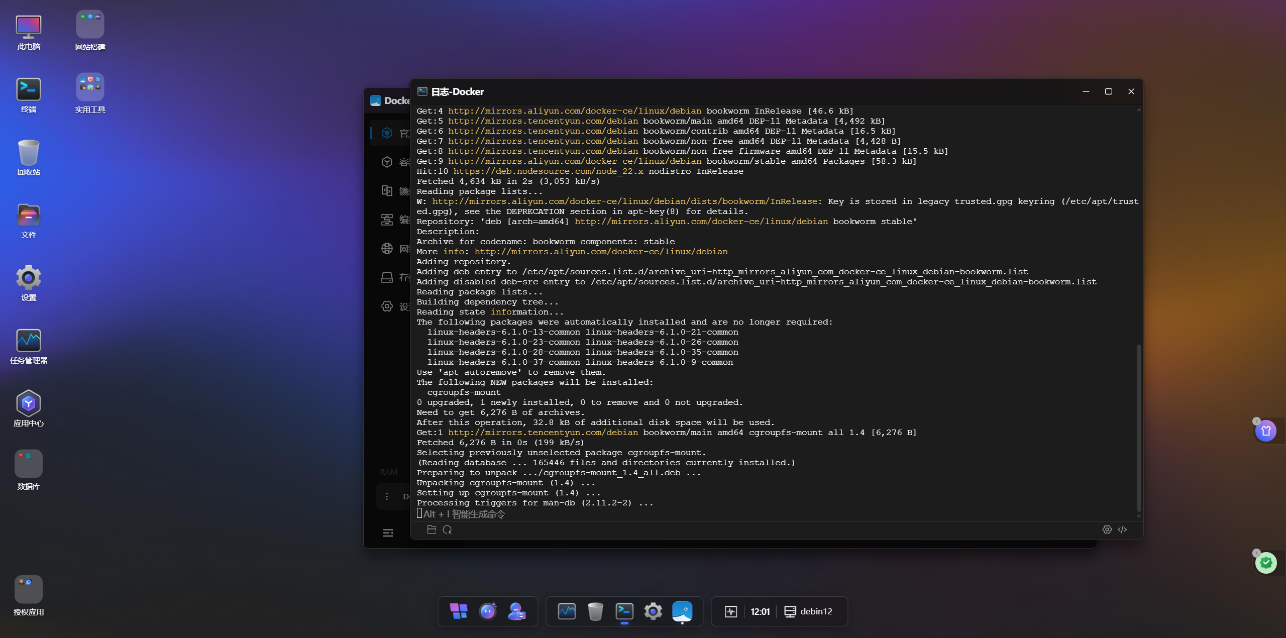 安装过程中,系统会弹出一个实时日志窗口。如上图所示,后台正在执行软件包更新及Docker引擎的安装逻辑,所有的技术细节都对用户透明化。